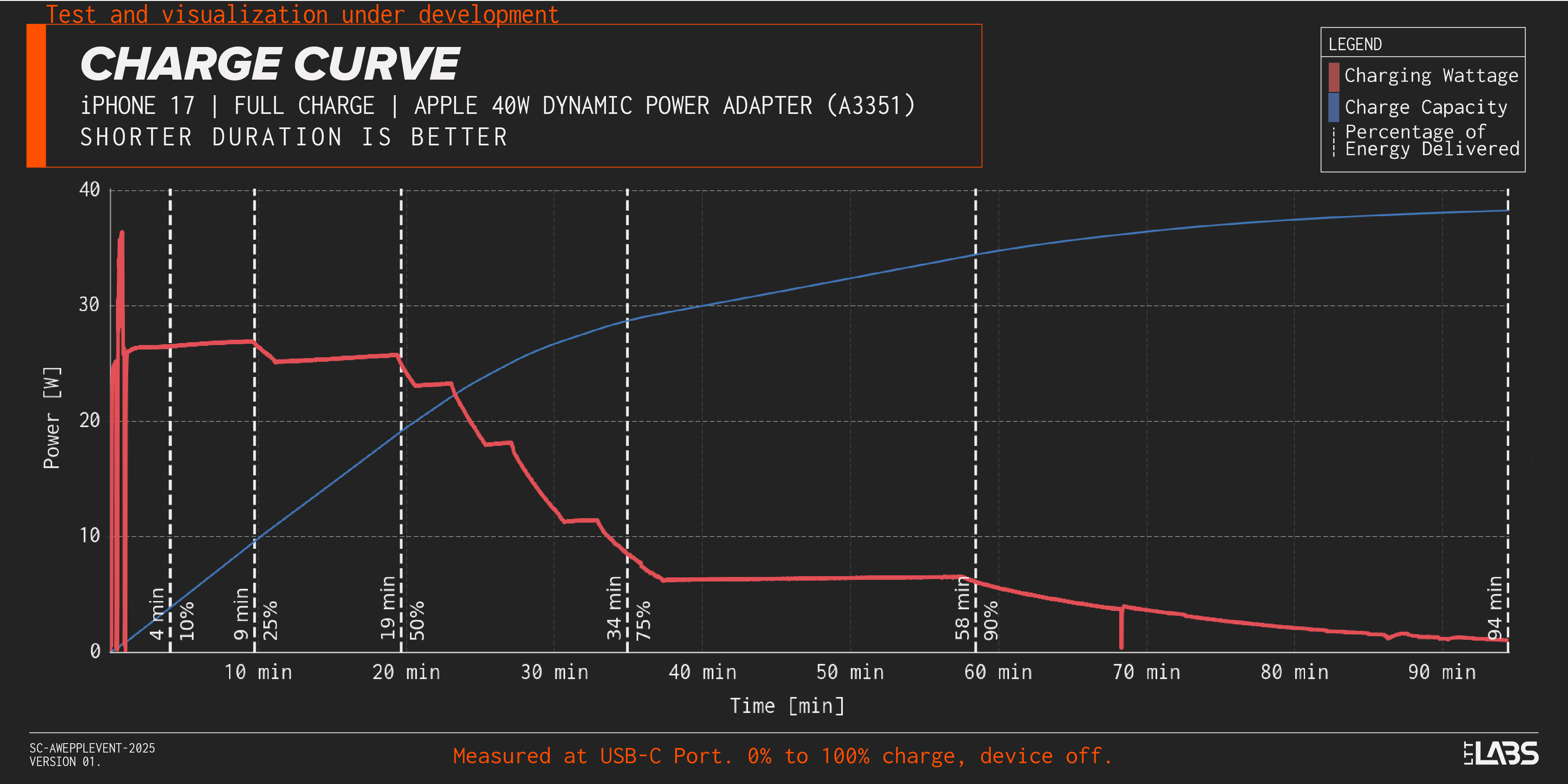 Since launch, this has predominantly received attention as the only power adapter that can achieve the claimed 50% battery in 20 minutes of the iPhone 17, iPhone 17 Pro, and iPhone 17 Pro Max. Firstly, the technology of the 40W Dynamic charger(including AVS) is completely within the USB-C Power Delivery(PD) specification, so no worries about Apple going rogue and proprietary. Also, from our testing it looks like other 40 W+ chargers are able to achieve the claimed 50% charge in 20 minutes. The iPhones don't even capitalize on the 40 W offered by the charger, reaching a maximum of around 38 W in our tests before they slow down significantly.