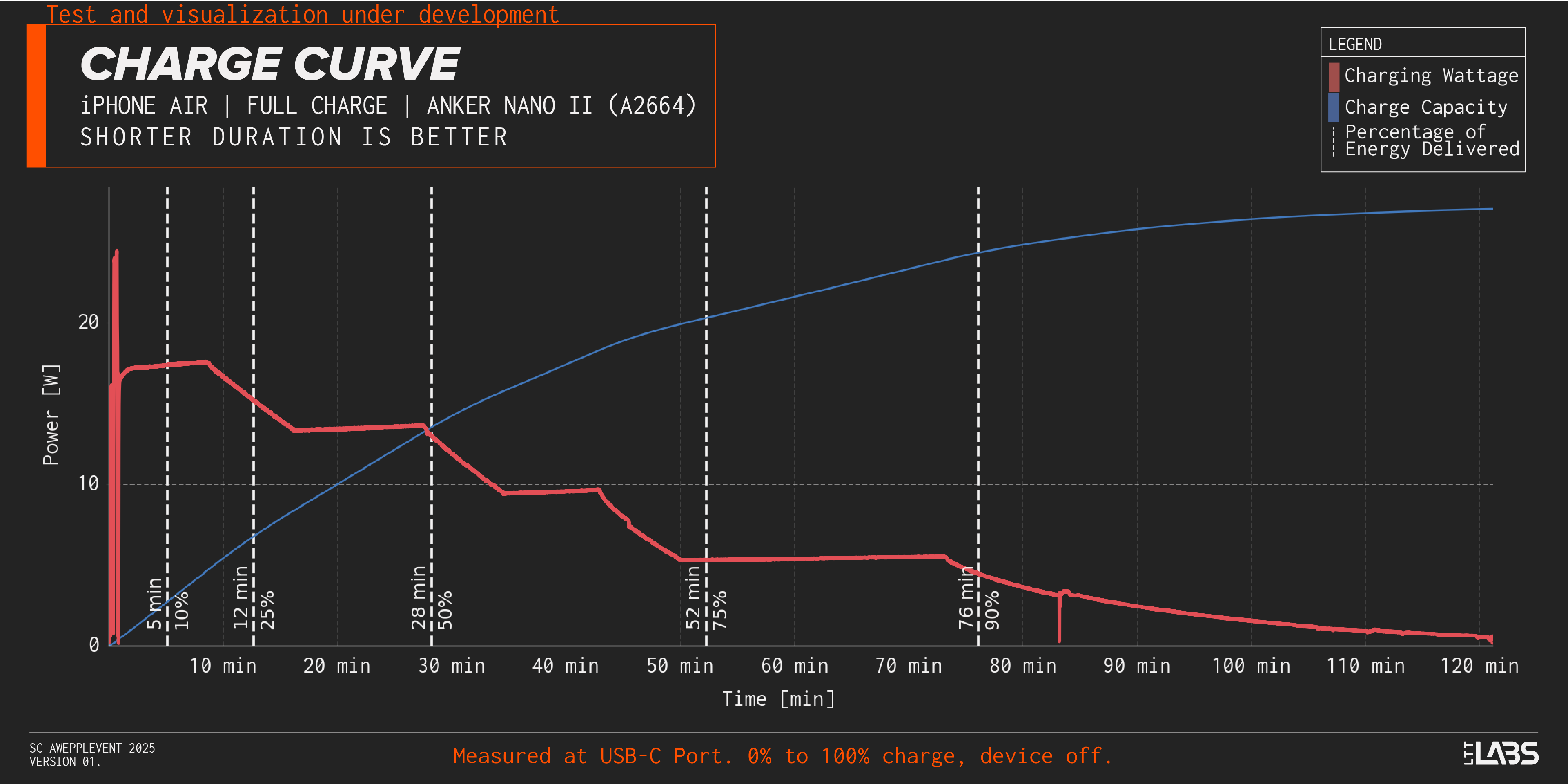 The iPhone 17 was also able to achieve the claimed 50% charge in 20 minutes and the iPhone Air confirmed the claim of 50% charge in 30 minutes with the ANKER NANO II 45W. It is interesting to note how long the wattage taper is. Wattage tapers are common with mobile devices but we've found iPhones to be particularly protective of the battery.