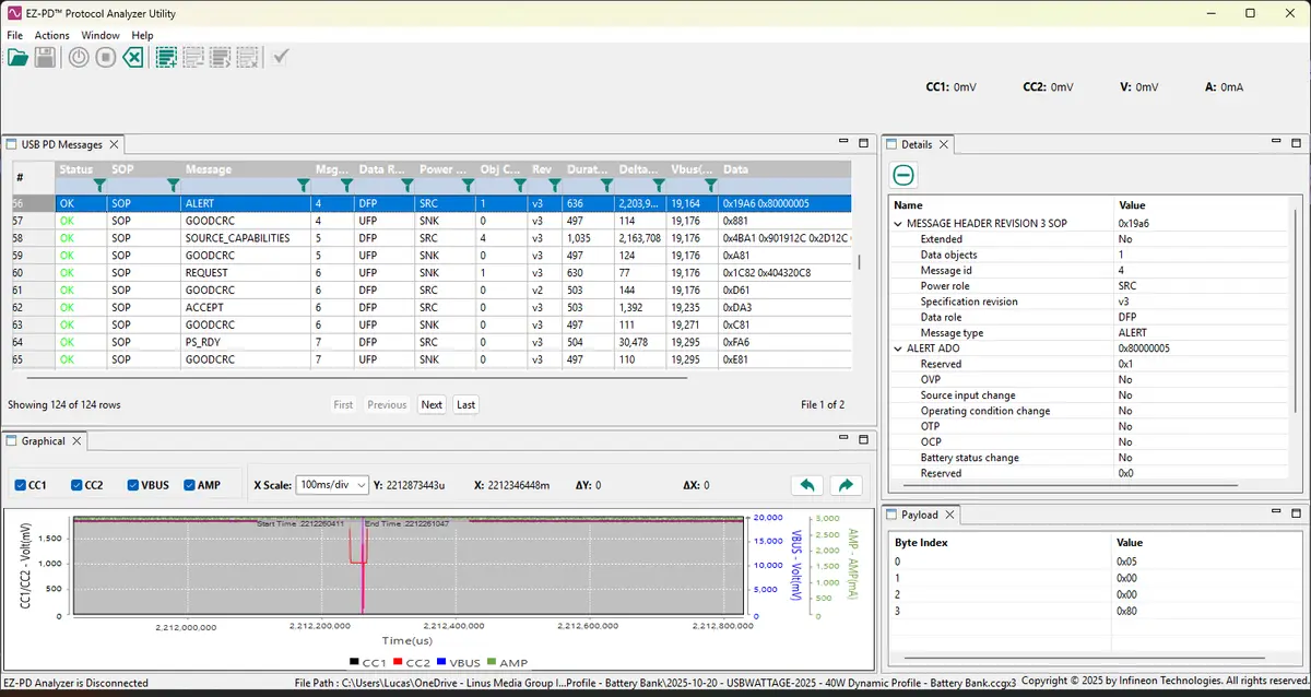 To confirm the 40W/60W claims of the 40W Dynamic charger I plugged it into an empty battery bank that is capable of drawing greater than 60W. It lasted for just over 36m43s at 60W when it derated to the 40W using an ALERT USB-C PD message from the source to the sink. Curiously, the ALERT message didn’t have any of the indicators asserted, but it was immediately followed by the source advertising its capabilities. I am not sure, but maybe it is standard in the USB-C PD specification for the sink to request a new power object.