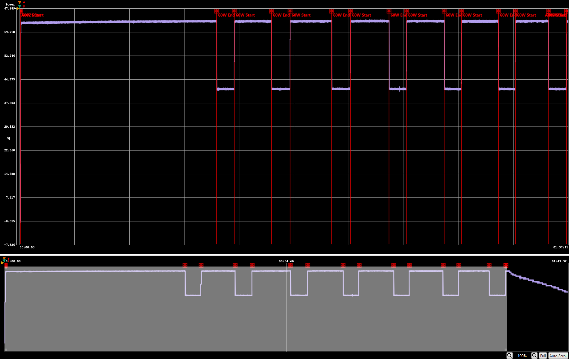 In an even more interesting turn of events, after charging at 40W for a couple minutes the 40W Dynamic charger went back to charging at 60W! It repeated this cycle a few times before I ended the test, below is a table showing the cycles that I measured.