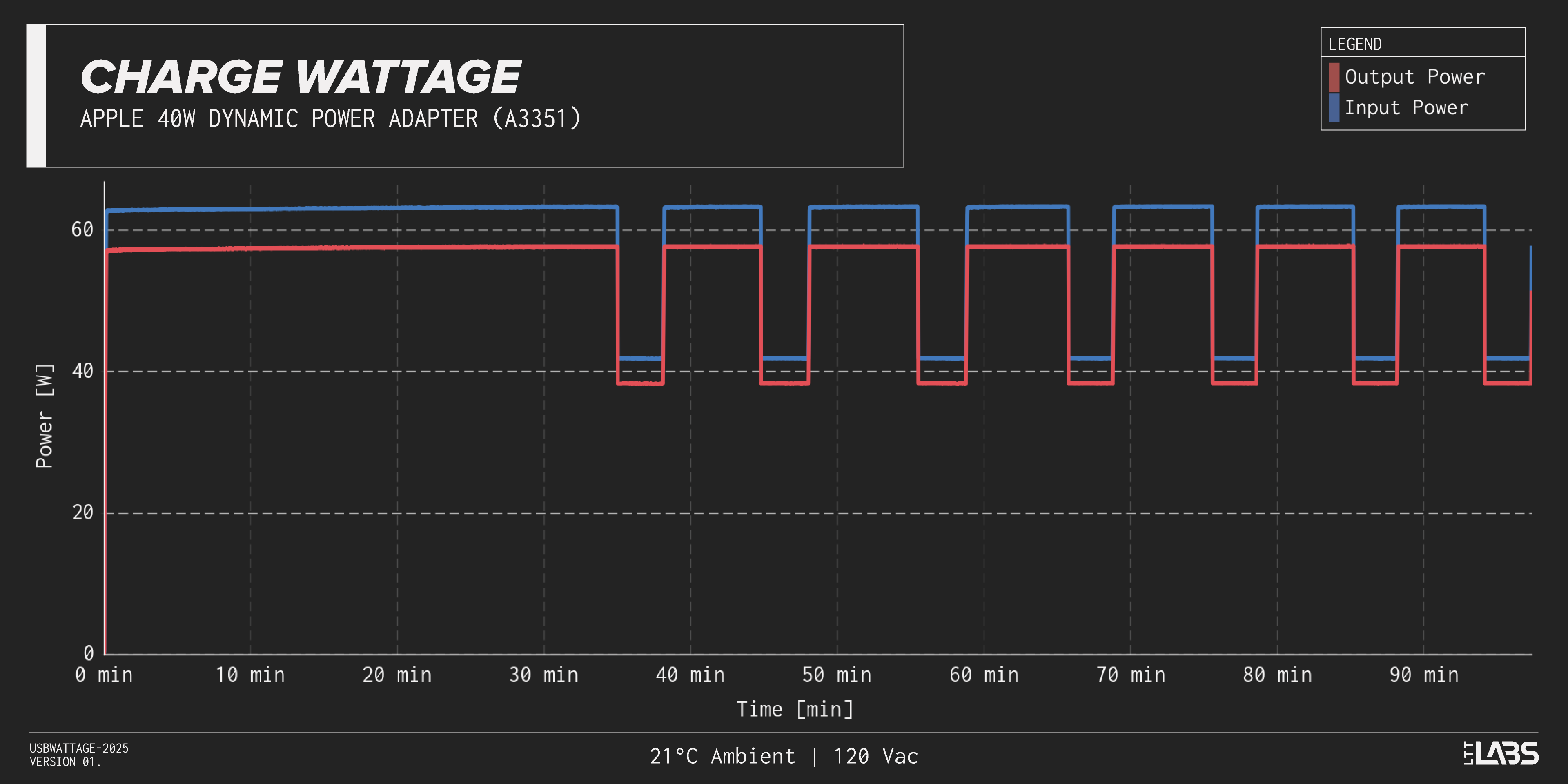 Bushwhacking through the Apple marketing, "dynamic" appears to be doing just this. On a 'cold start', it will supply 60W until it reaches a point where it risks hazardous temperatures, after which it will step down to 40W. We don’t have a full USB-C load setup at this point but I used the 40W dynamic to charge a large battery bank and it was able to charge at 60W for almost 35 minutes before stepping down to 40W. It then stepped back up to 60W after a few minutes, see Appendix A for more on this, there is a lot more. A user on Reddit did some impressive investigation and achieved 20 minutes before the derating. Our testing was done in an ambient of roughly 21°C, though there are many factors to consider so it will vary for everyone.