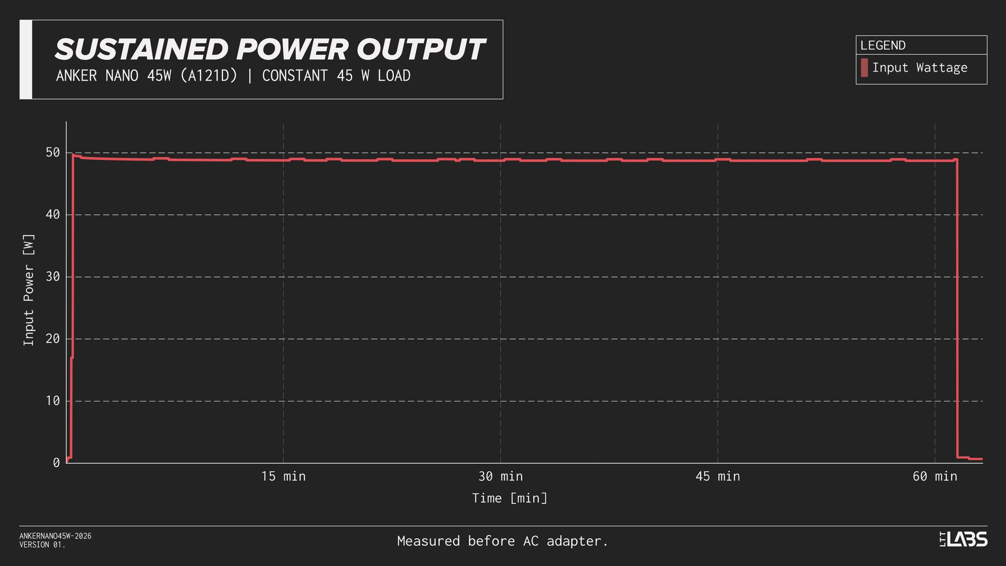 As the Anker Nano 45W is slightly smaller, I thought it might eventually step down in wattage to protect itself, but I was able to output a constant 45 W while pulling 3 A at 15 V for an hour with no drops.