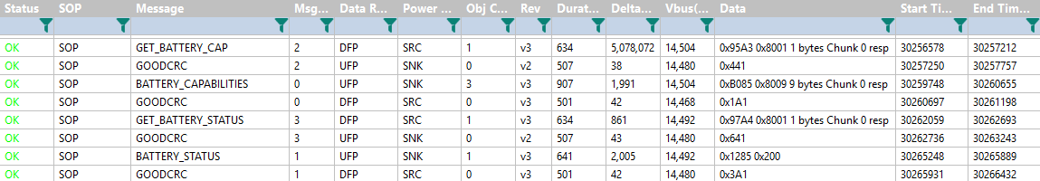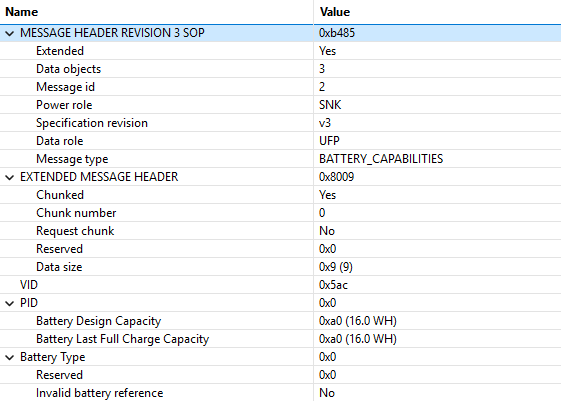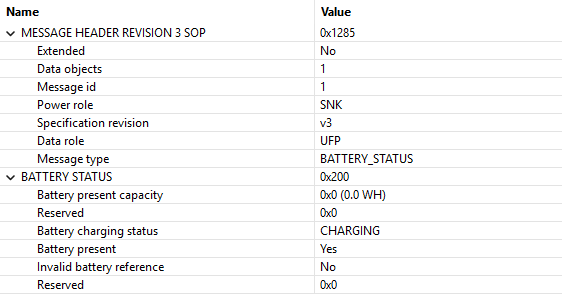 It turns out that there are USB-C PD messages specifically made for battery reporting purposes. There is GET_BATTERY_CAP with response BATTERY_CAPABILITIES, and GET_BATTERY_STATUS with response BATTERY_STATUS.(GOODCRC is just an acknowledge)