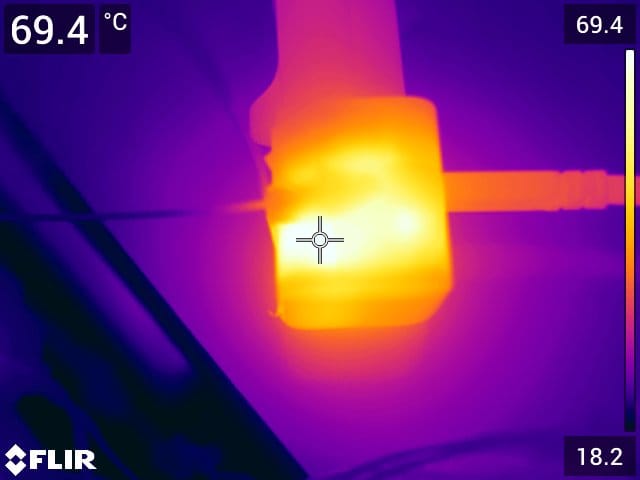 During the endurance 45 W output testing, I again used a thermocouple logger with K-type thermocouples, but now affixed to the surface of the charger using Kapton tape to collect temperature data. I also used our FLIR camera to capture a few measurements(on matte surfaces).