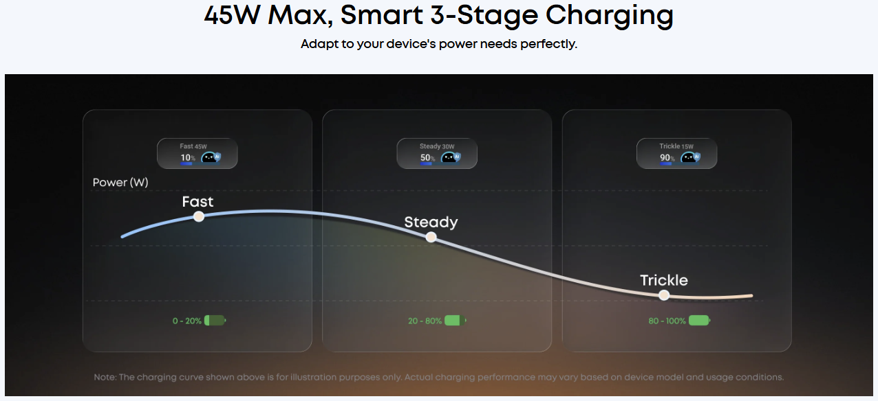While the Care Mode and built-in display may offer some functionality to users, I believe the "Smart 3-Stage Charging" is slightly misleading. From my knowledge of USB PD and some experimentation with this device, besides "Care Mode", the power adapter/charge only plays a very passive role in the charging cycle. It isn't dictating the wattage at which your device is charging, and you probably don't want it to.