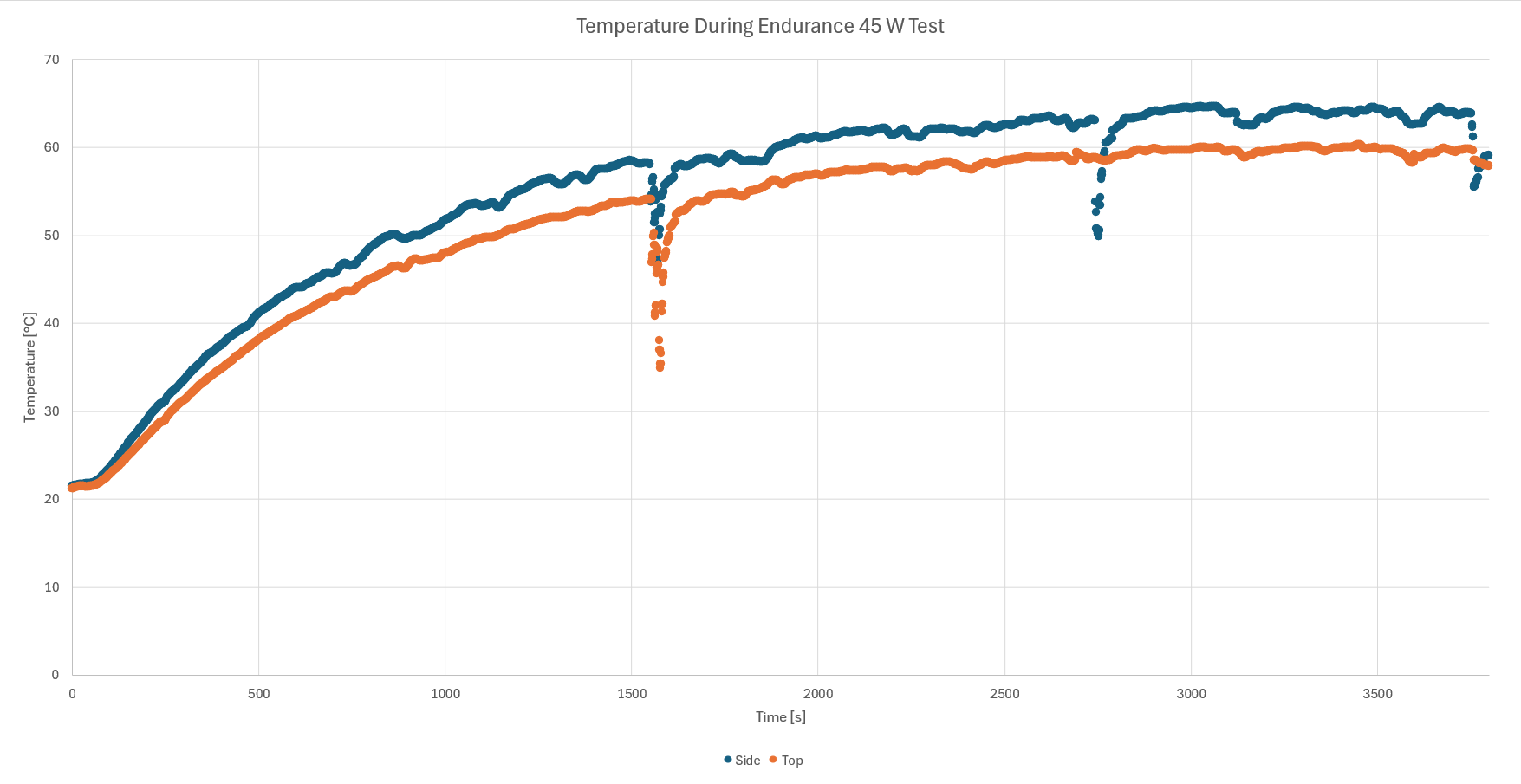 I am not entirely confident in the absolute values of these measurements but they do allow us to observe that the charger was near thermal equilibrium after 60 minutes. The charger could potentially derate itself with a longer charge test.