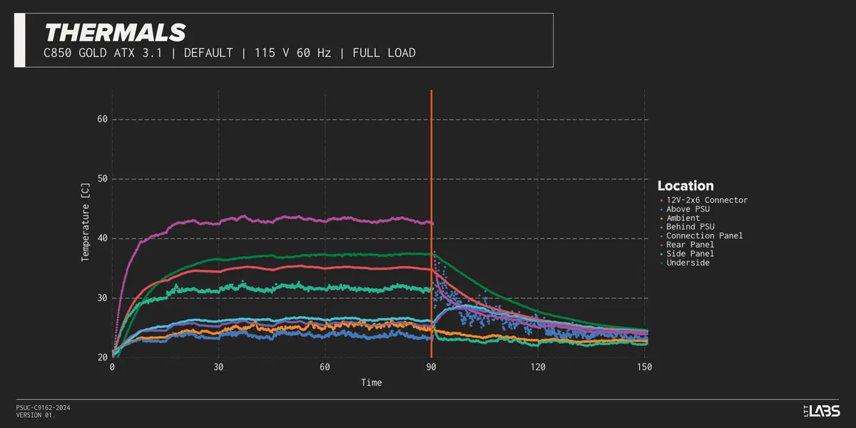 We compared two power supplies: the NZXT C850 ATX 3.1 and the Cooler Master X Silent Edge Platinum 850. Both are 850W, ATX 3.1, and in the same ATX form factor. We tested them at 115V because it’s less efficient, generating more heat. We ran them both at full load (850W) for 90 minutes, then let them cool for an hour. Throughout the test, we used thermocouple probes to measure temperatures at various points on each unit.