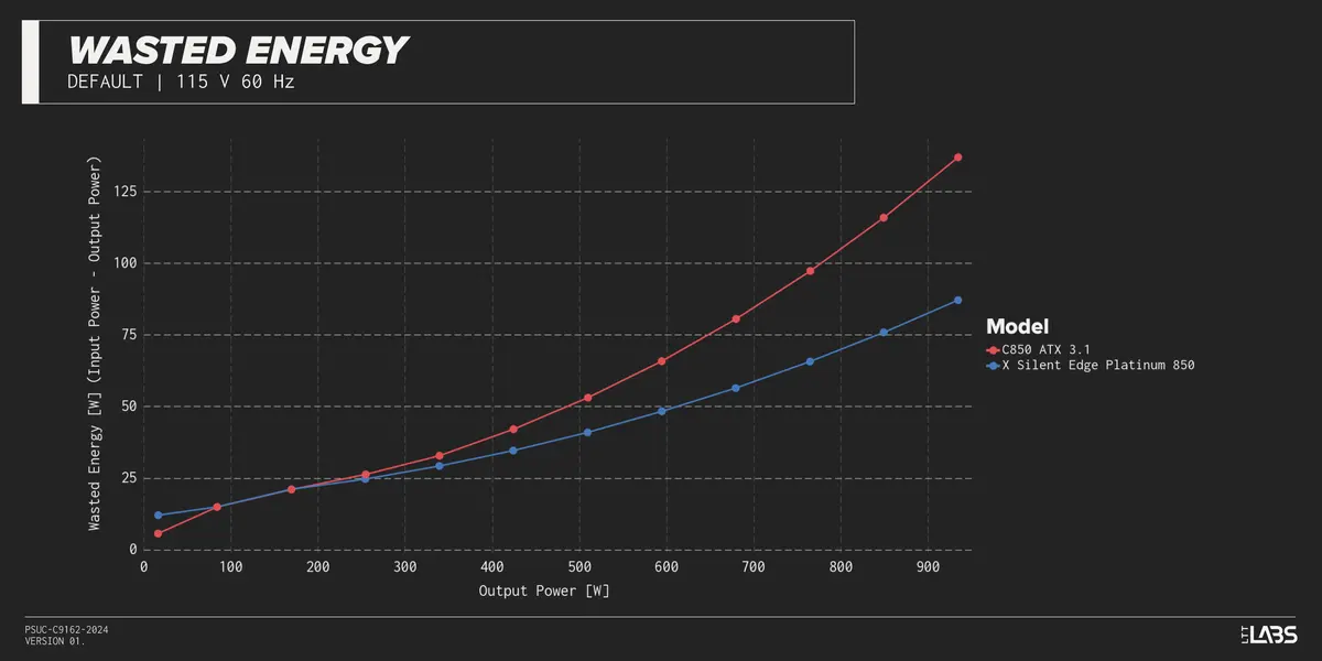 In terms of efficiency, the X Silent Edge Platinum 850 is a bit underwhelming at lower loads, although it excels at high wattages. This is likely an intentional design by Cooler Master as a slight efficiency gain at high wattages will save many more watts of power than the same gain at low wattages. The Cooler Master (represented by the blue line in our wasted energy graph) generates much less heat than the NZXT (the red line) at higher wattages.