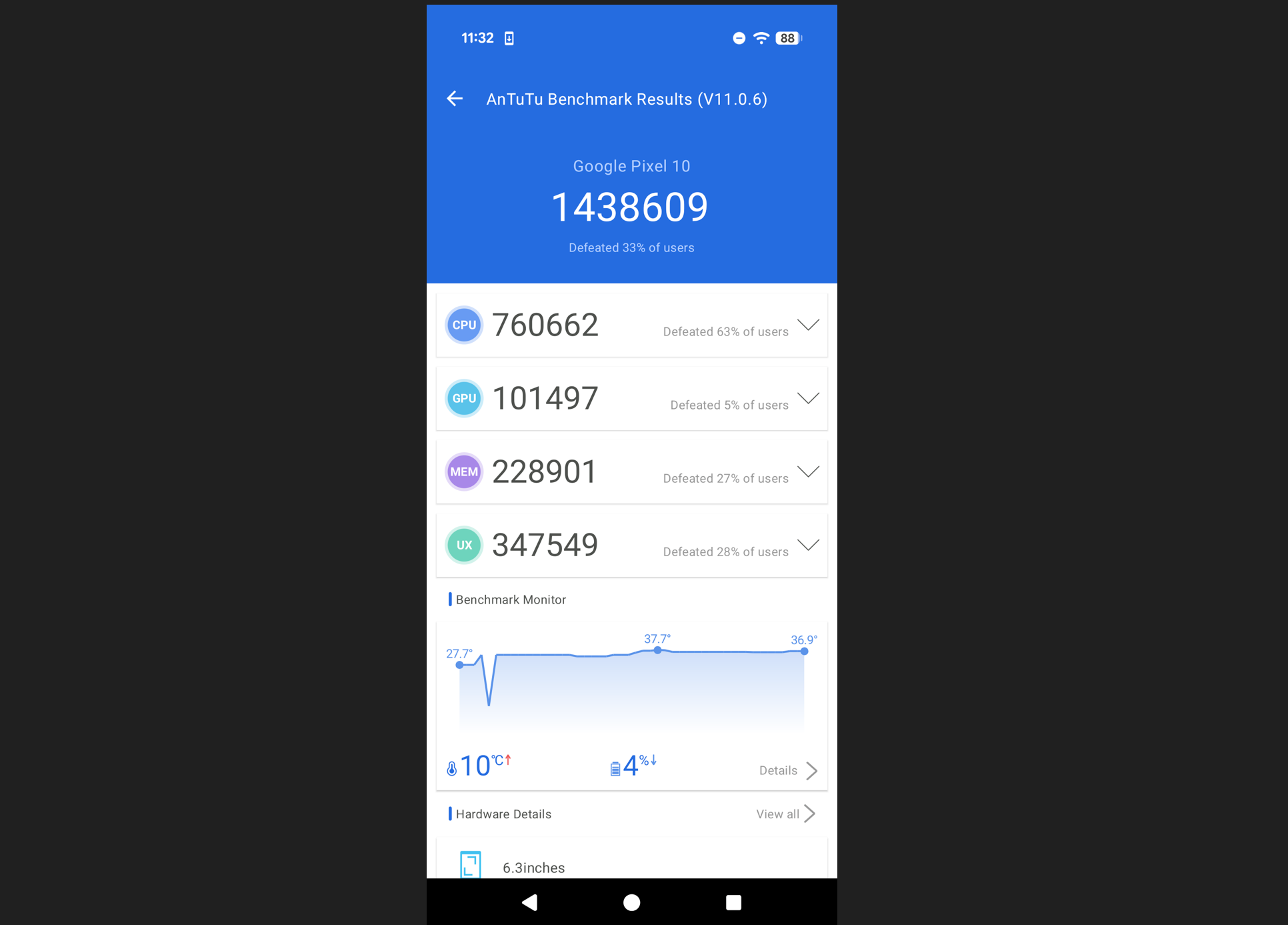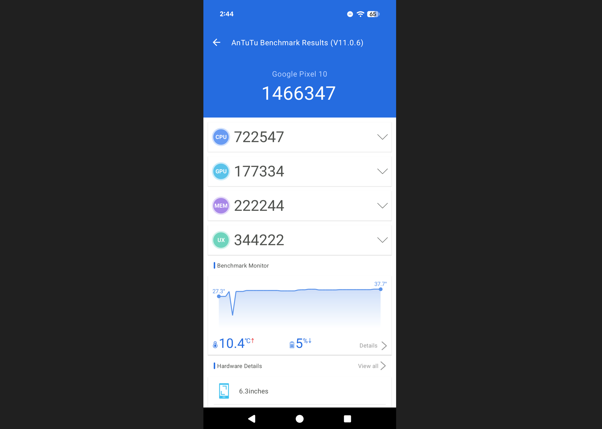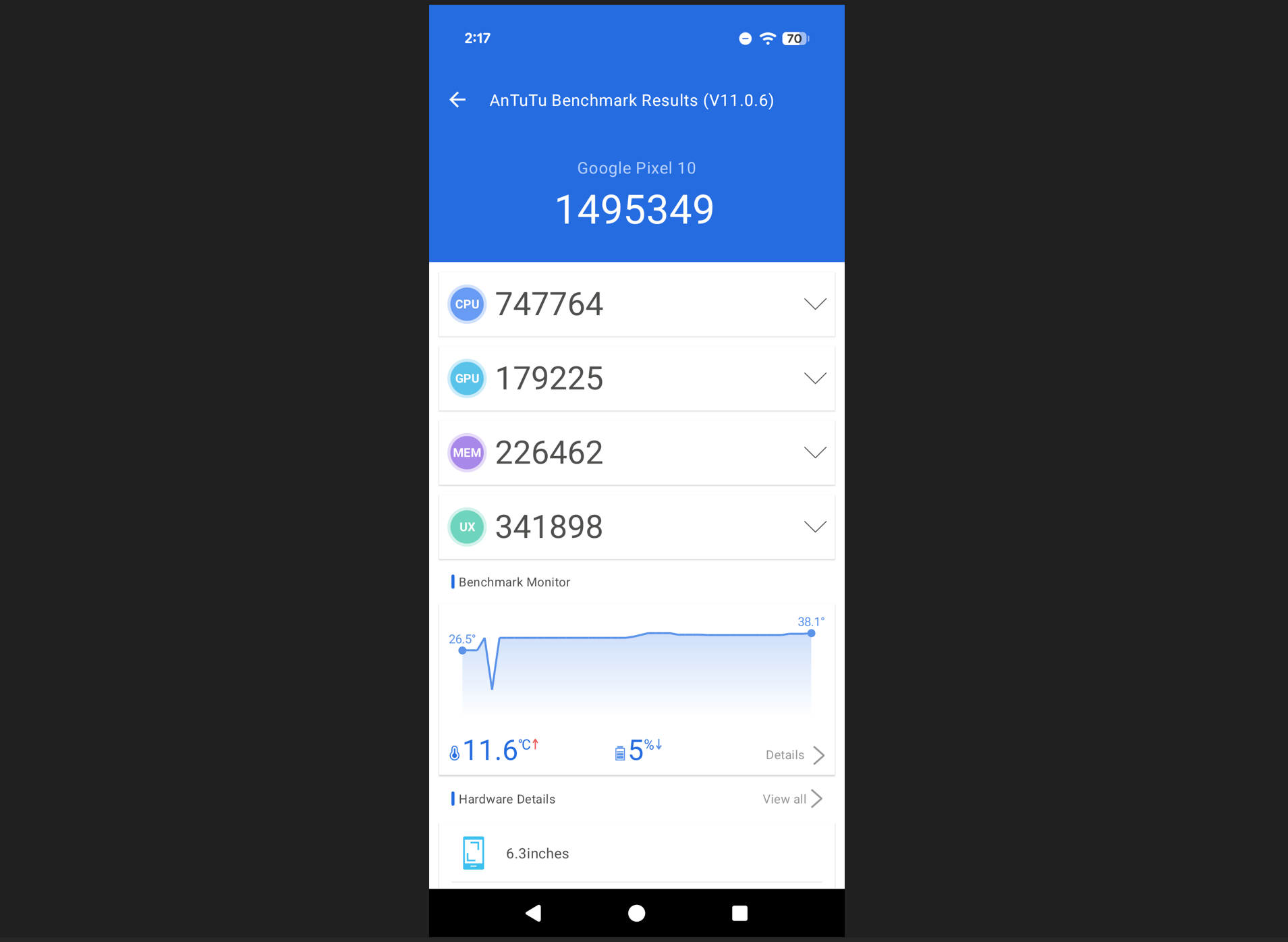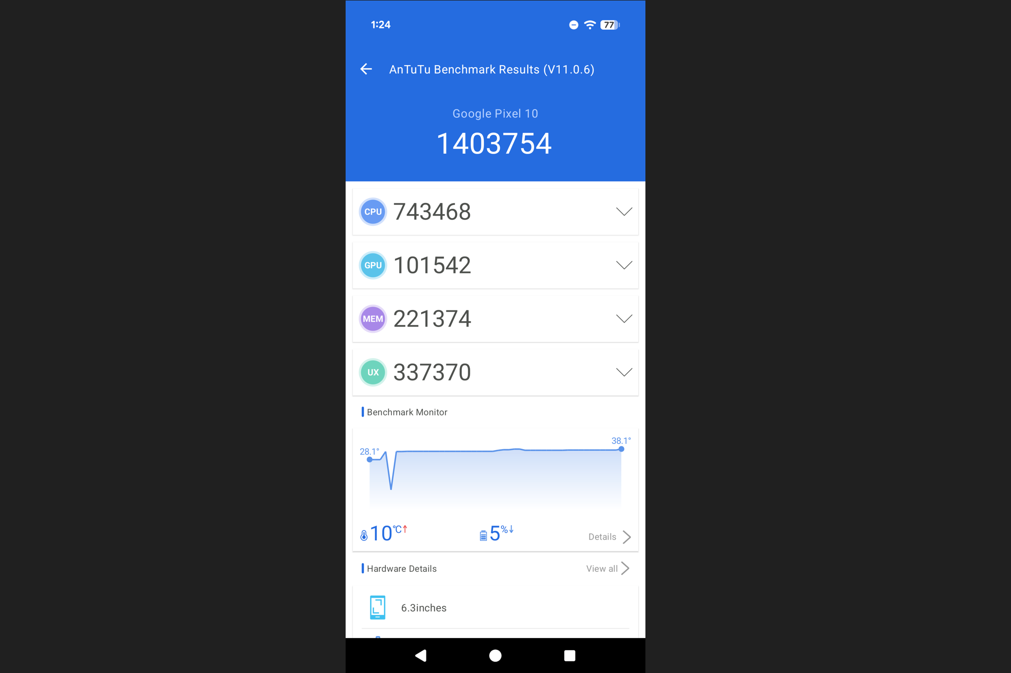 Below are the six screenshots of our AnTuTu benchmark results on the initial system build of the Pixel 10.
