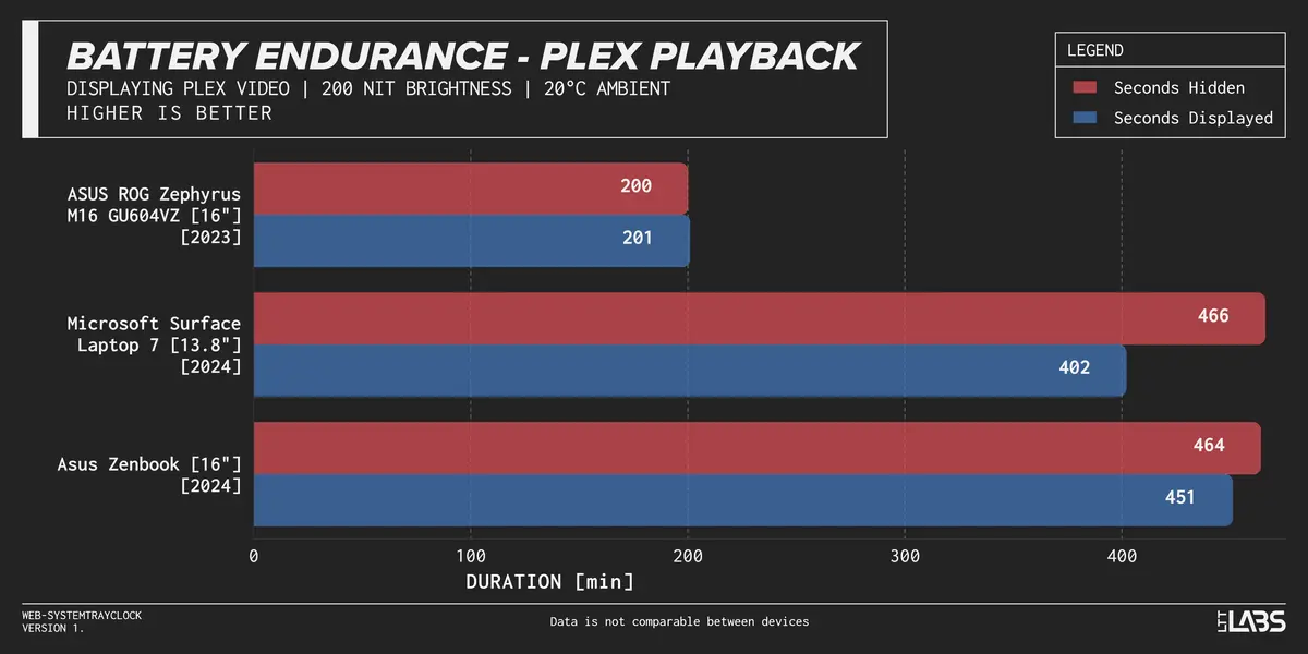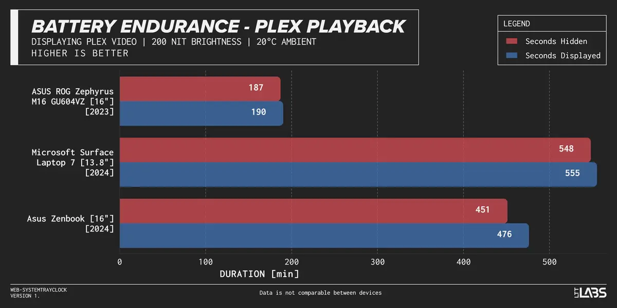 - The Asus Zenbook 16 (2024), an x86 ultrabook with integrated graphics, dropped from 654 minutes (10 hours, 54 minutes) to 608 minutes (10 hours, 8 minutes), a 46-minute or roughly 7% reduction.