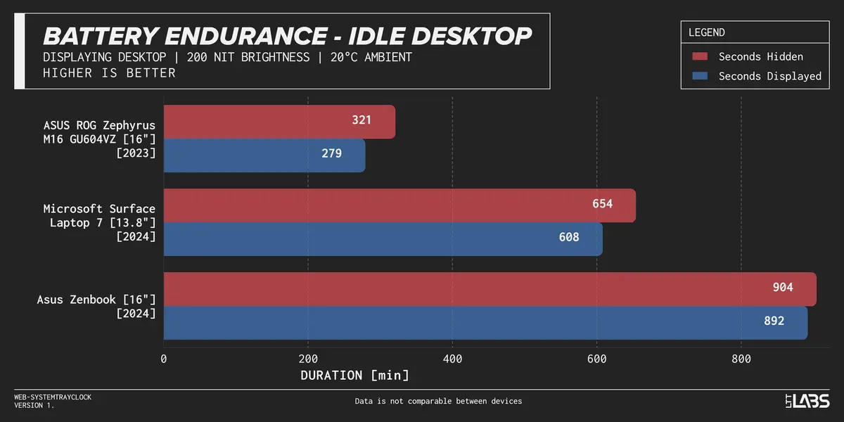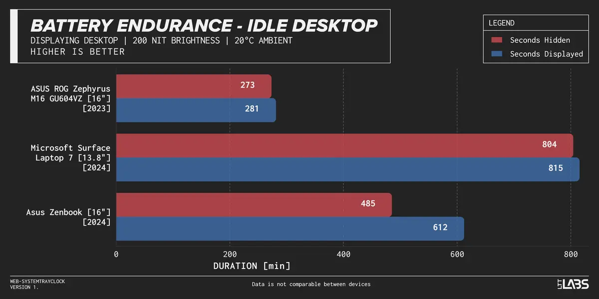 - On the ASUS ROG Zephyrus M16 GU604VZ, battery life stayed nearly identical. With seconds hidden, it lasted 200 minutes (3 hours, 20 minutes), and with seconds shown, it lasted 201 minutes (3 hours, 21 minutes), a difference of +1 minute or +0.5%.