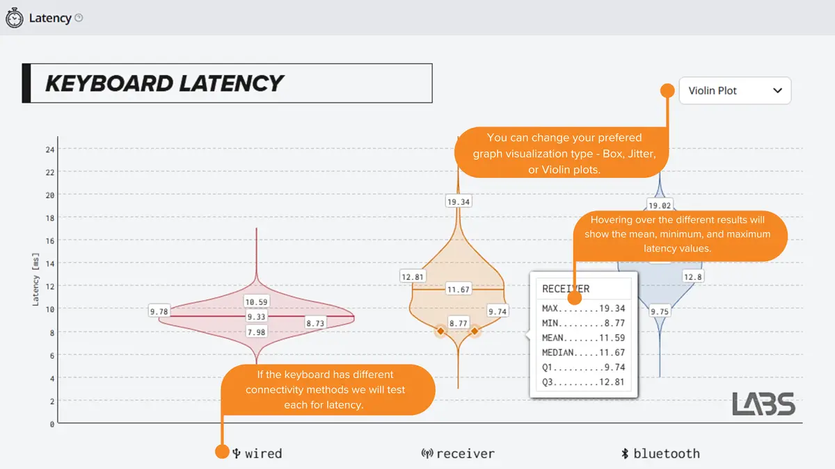 The data is visualized in various graph formats, showing the mean, minimum, and maximum latency values. We test each connectivity option - Bluetooth, Receiver, and Wired - ensuring the results are comprehensive and comparable across different keyboards.