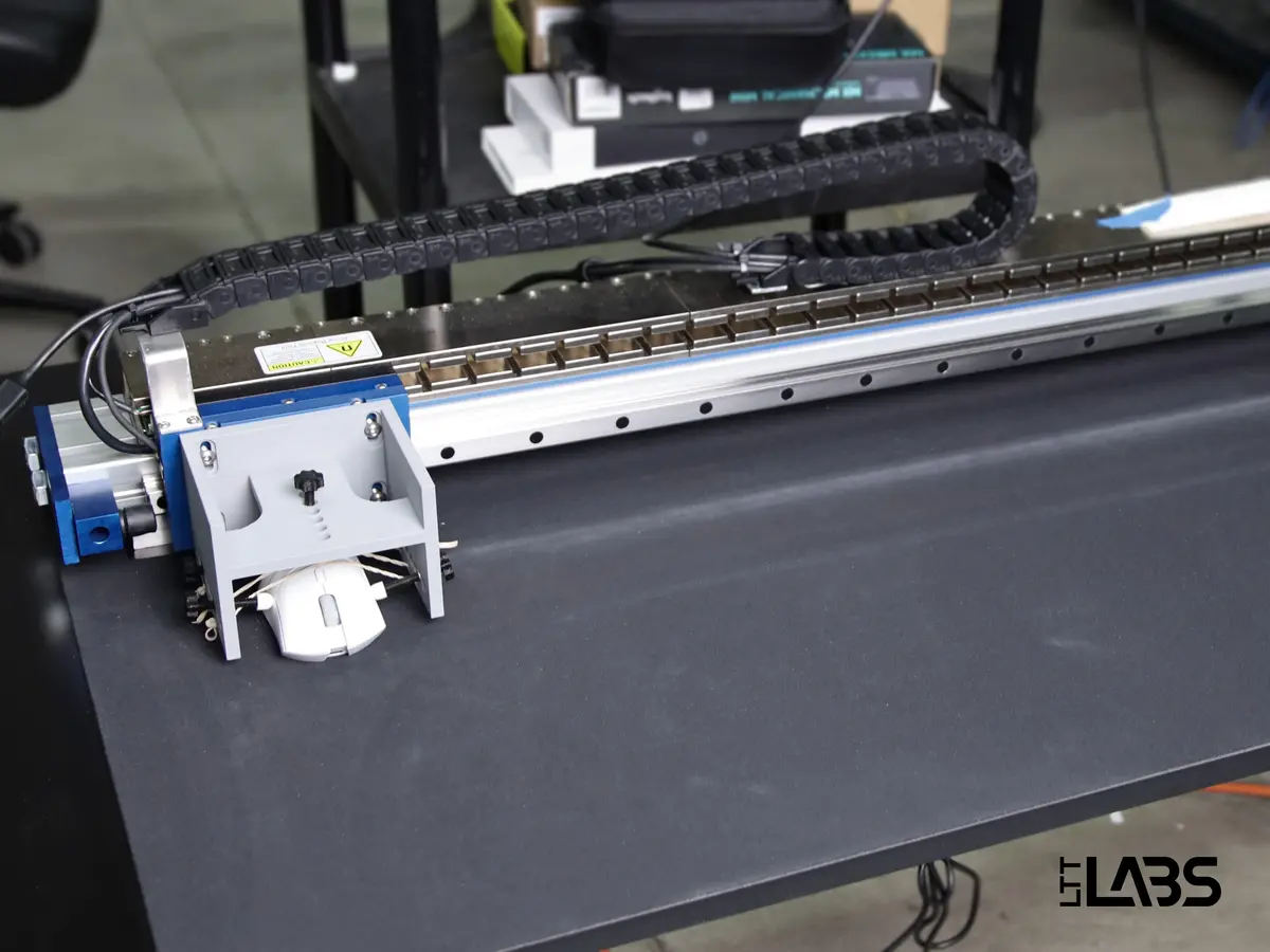 Sensor Test Bench: Our setup includes a specialized mouse sensor tester and a test bench computer running dedicated software for precise DPI measurement. The sensor tester is a custom build comprised of a H2W Tech Single Positioning Stage Brush Linear Motor Driven Rail (SRS-036-05-017-01-EX) and a H2W Tech Programmable Motion Controller (MCSA-30011-1HP-10).