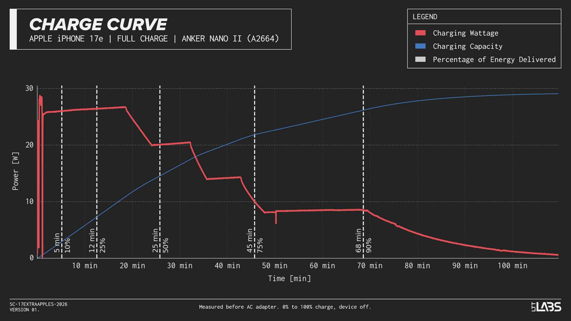 We are able to confirm Apple's claim of 50% charge in 30 minutes by measuring the energy delivered to the iPhone through a 45 W USB Type-C power adapter. The iPhone 17e did also achieve the claimed 20 W charging, the same as the iPhone 16e.