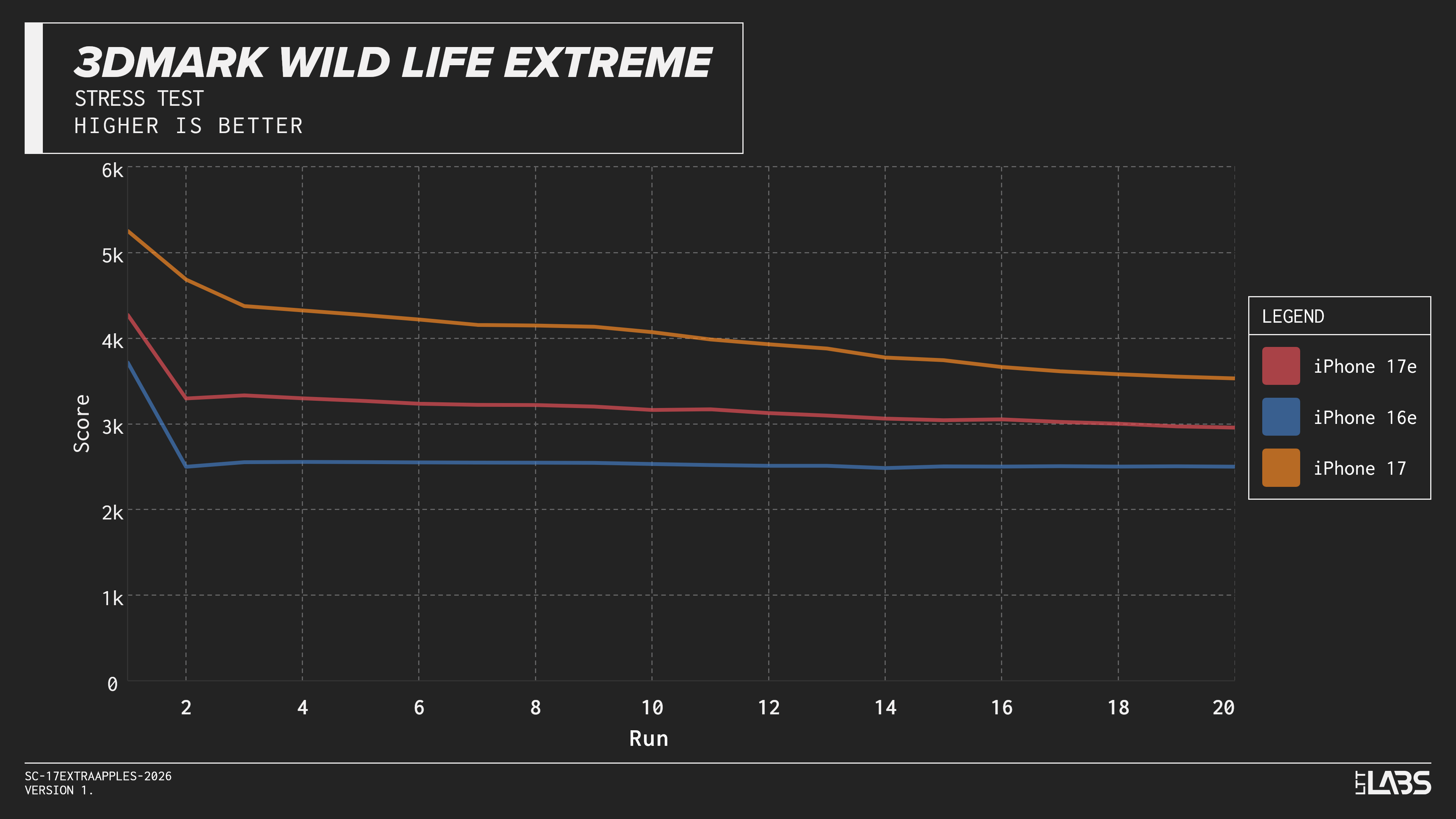 The GPU focused 3DMark benchmarks highlight the difference that the extra GPU core of the iPhone 17 can make, where the iPhone 17 scores 20-23% higher. This will be noticeable in gaming, but the iPhone 17e still has enough power to ensure smooth animations during regular use. This is helped by its lower refresh rate 60 Hz display compared to the 120 Hz display of the iPhone 17.