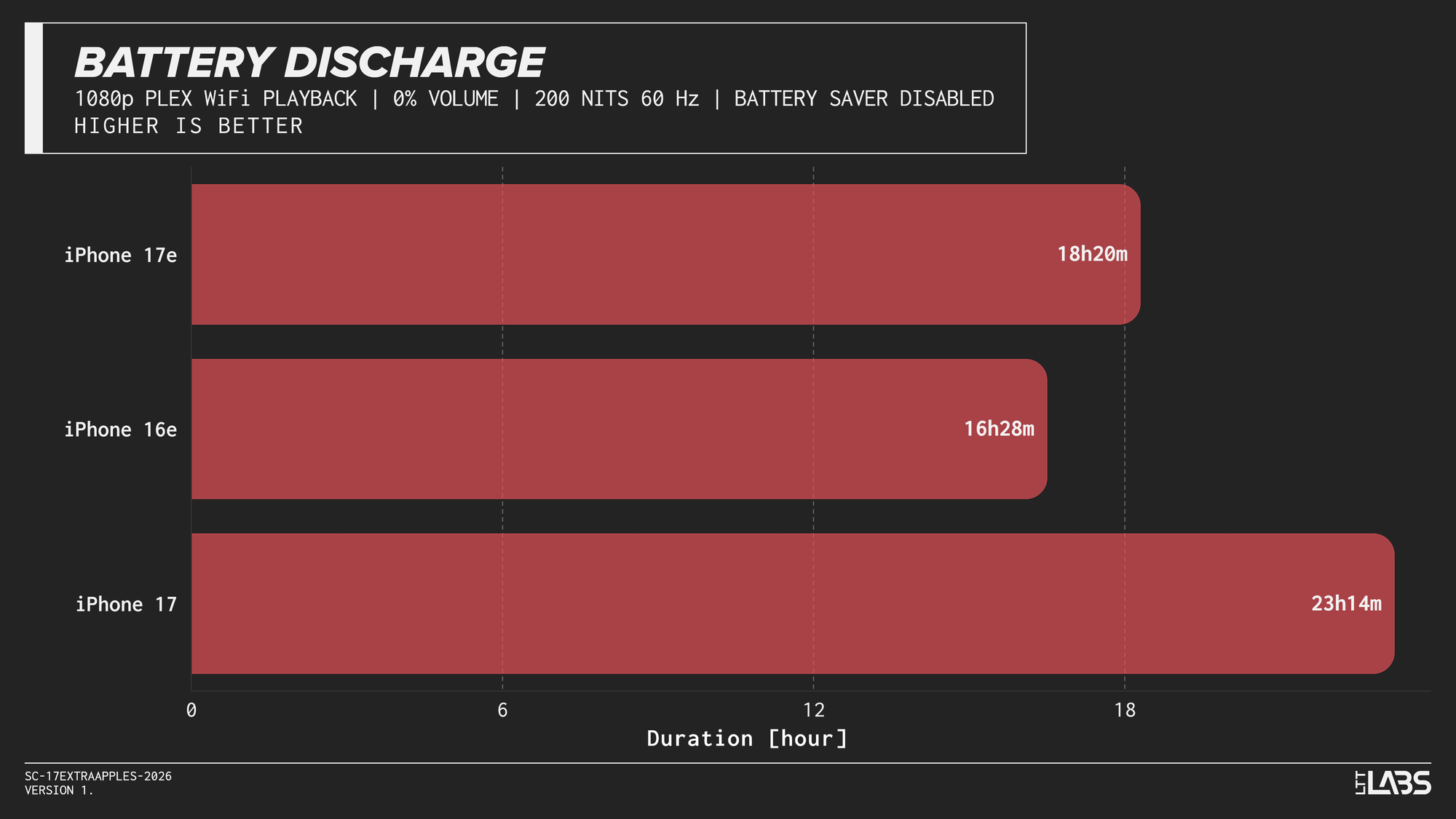 In our battery discharge test where the device streams 1080p video from a local Plex server until the battery is drained, we see that the iPhone 17e has a battery life improvement on the iPhone 16e, while still falling significantly short of the iPhone 17. These tests were performed identically but there is variance to the battery life testing, as explored in this previous article.