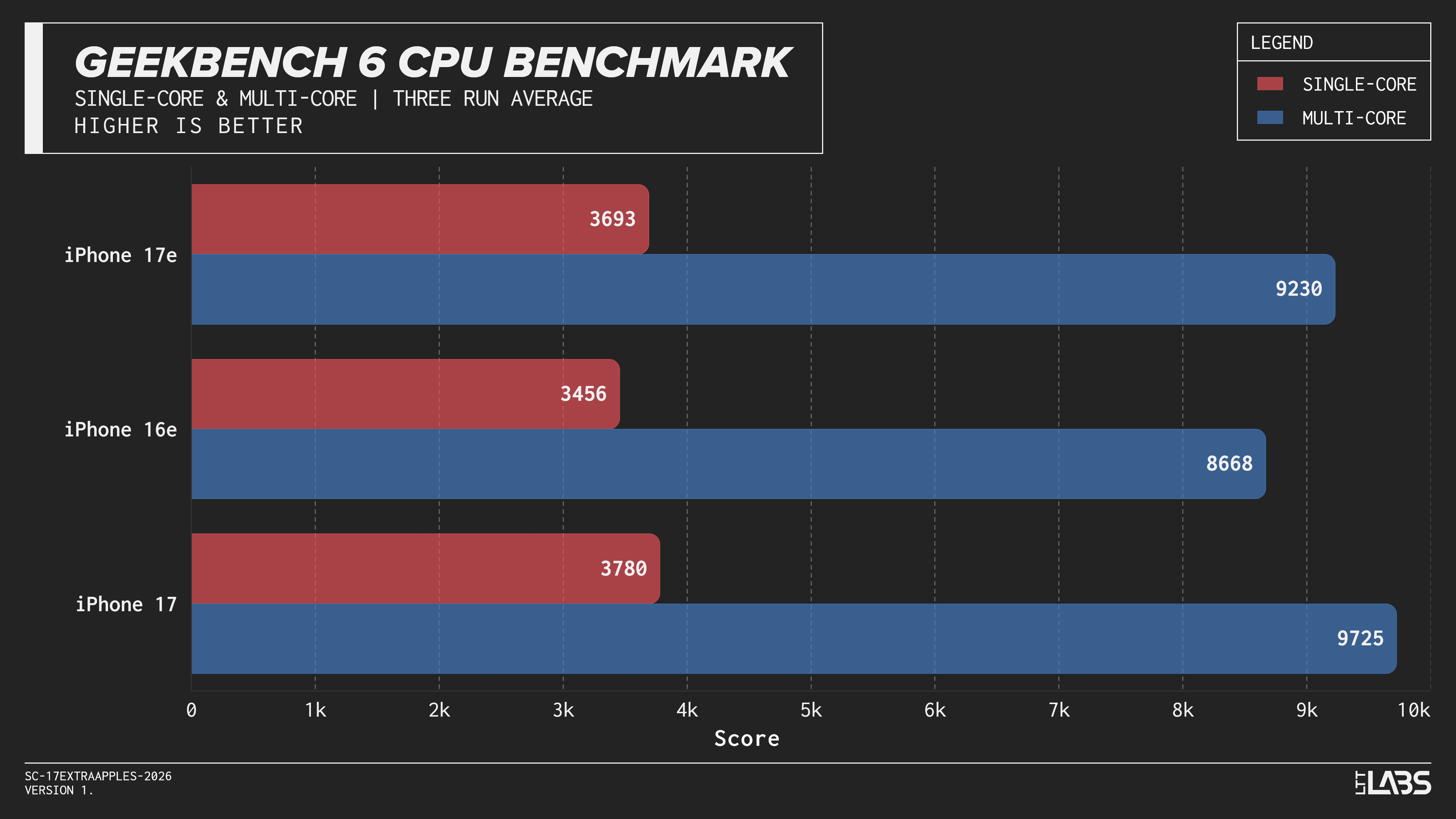 The iPhone 17e has the same A19 processor as the iPhone 17, but one of the GPU cores has been disabled. The similarity of the processors is shown in the CPU focussed Geekbench 6 CPU benchmarks where the iPhone 17e has 2-5% lower performance than the iPhone 17 over the average of three runs.