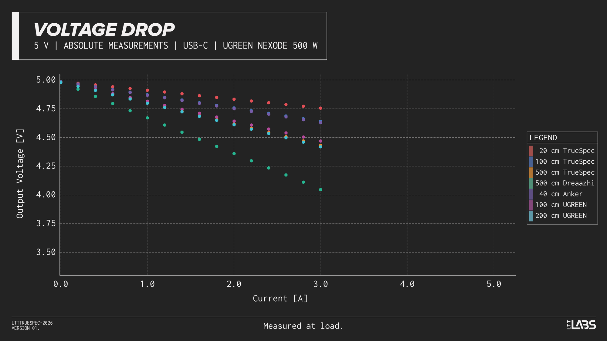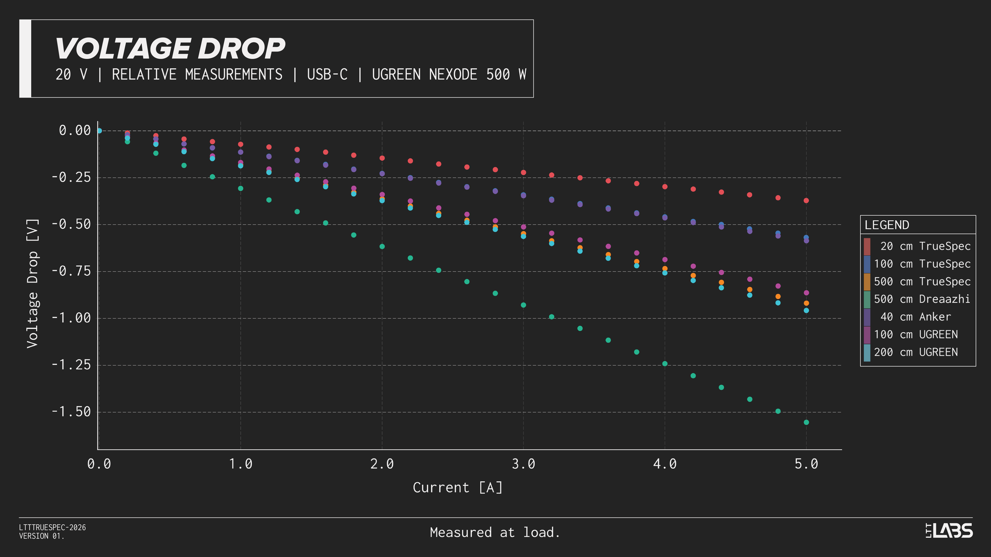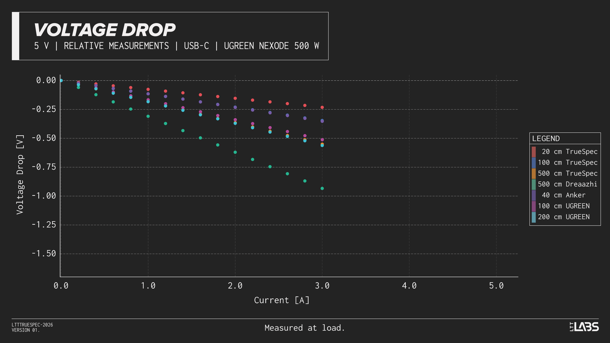 Considering the shortest cable we tested(LTT TrueSpec 20 cm) as a 'reference', we can see that even with a short cable, there is nearly a 0.25 V drop inherent to the test setup when delivering 5 A. This voltage drop should be considered for the all measurements above.