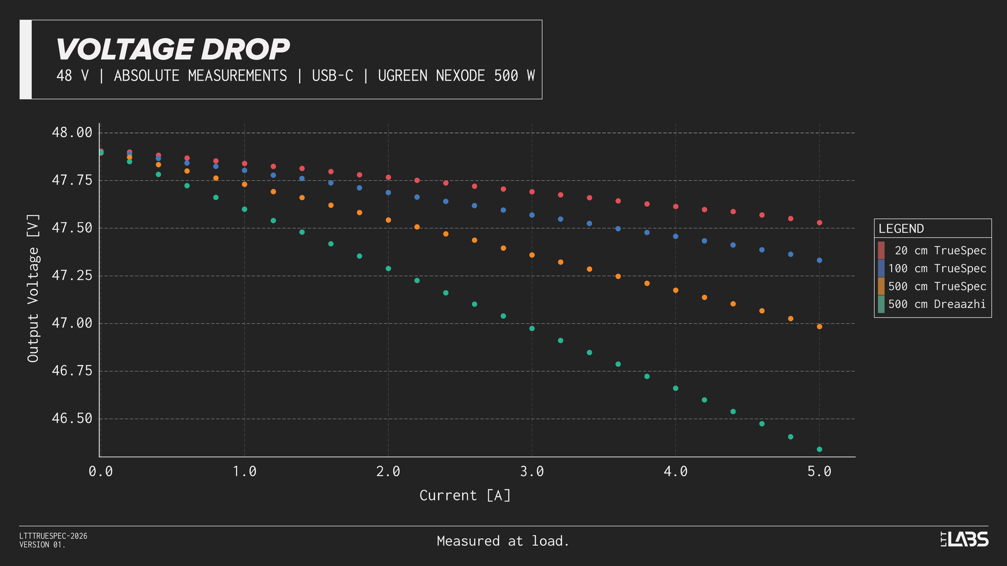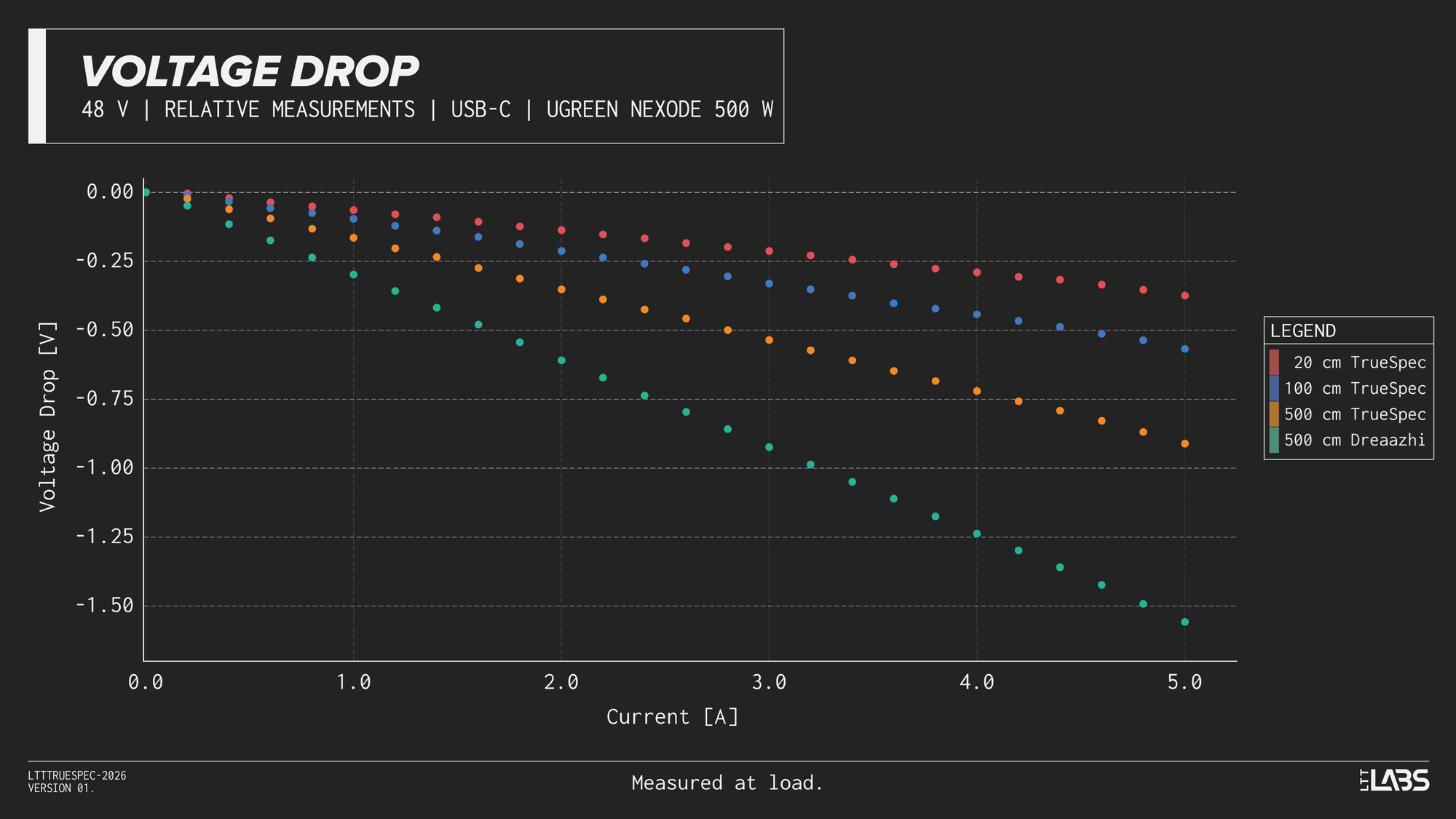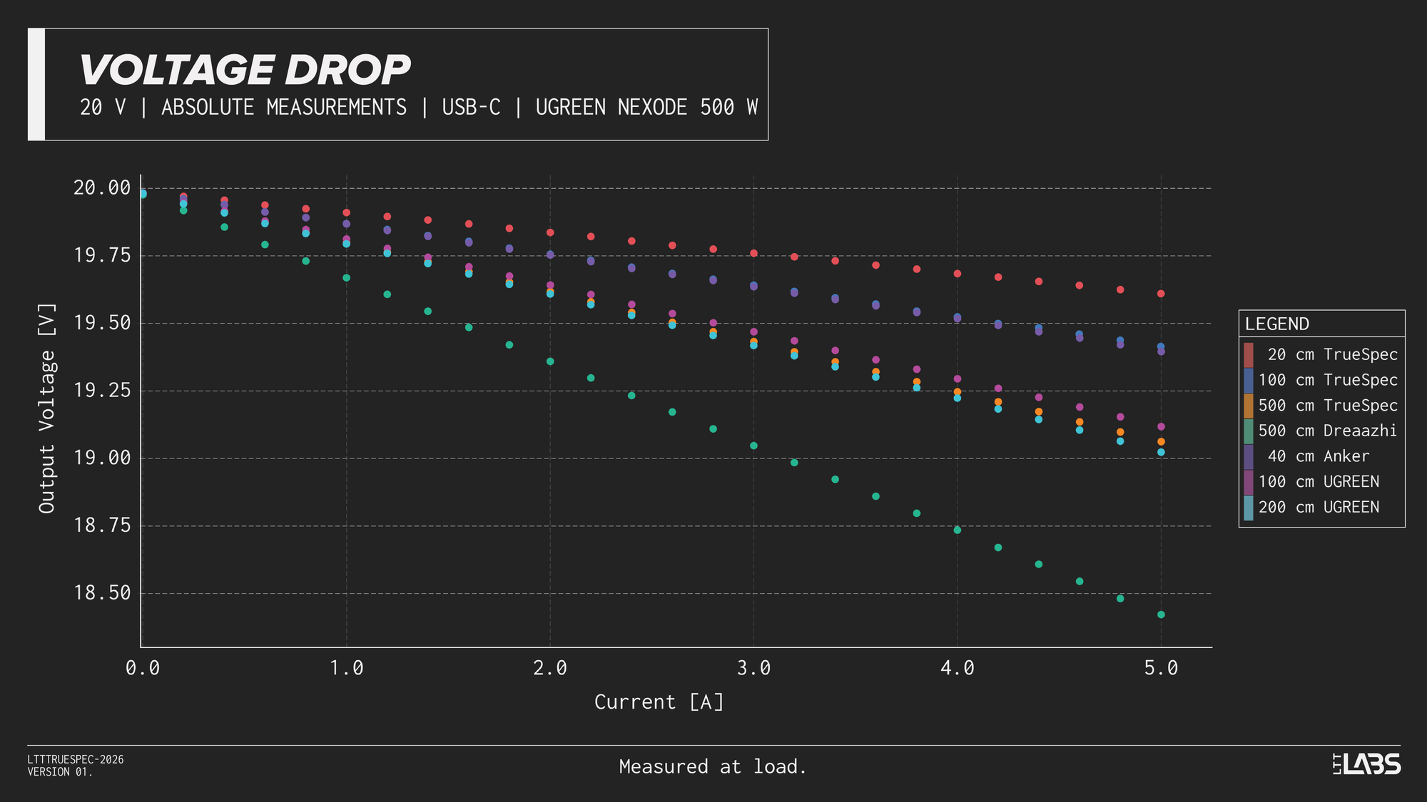 Considering the shortest cable we tested(LTT TrueSpec 20 cm) as a 'reference', we can see that even with a short cable, there is nearly a 0.25 V drop inherent to the test setup when delivering 5 A. This voltage drop should be considered for the all measurements above.