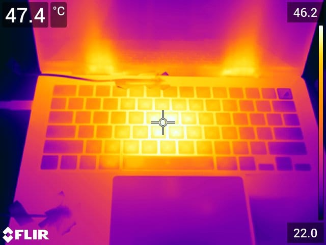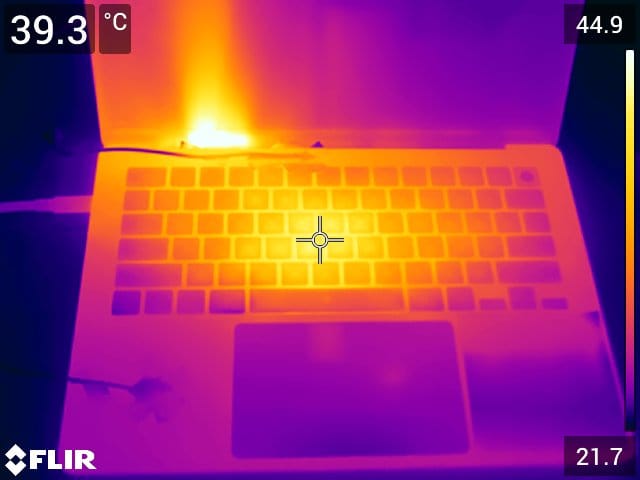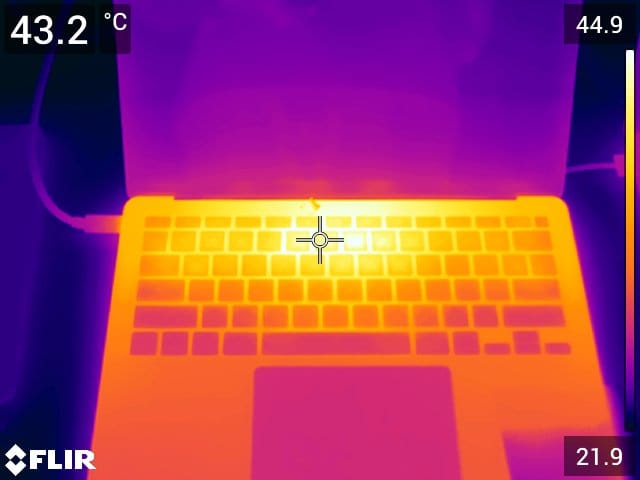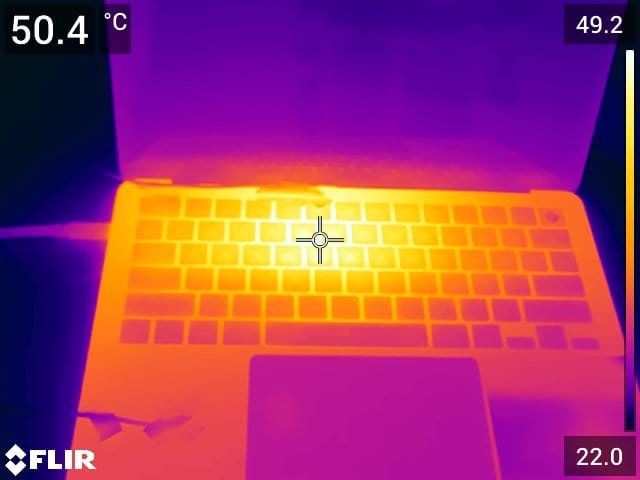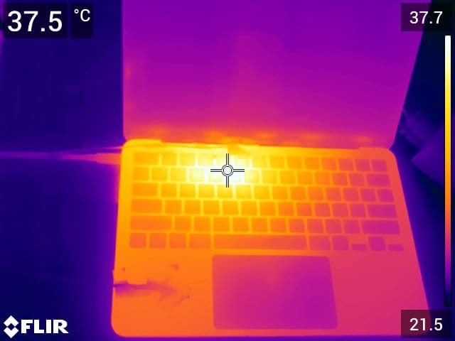 We used a FLIR T540 to capture images of the laptops under load. This allows us to identify hotspots and perform some approximate temperature measurements.