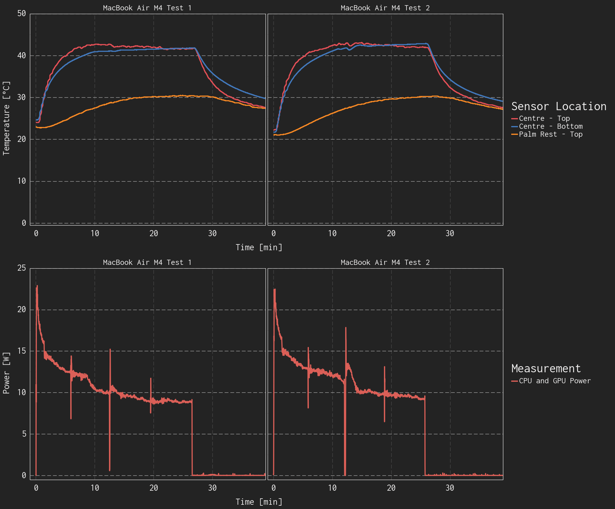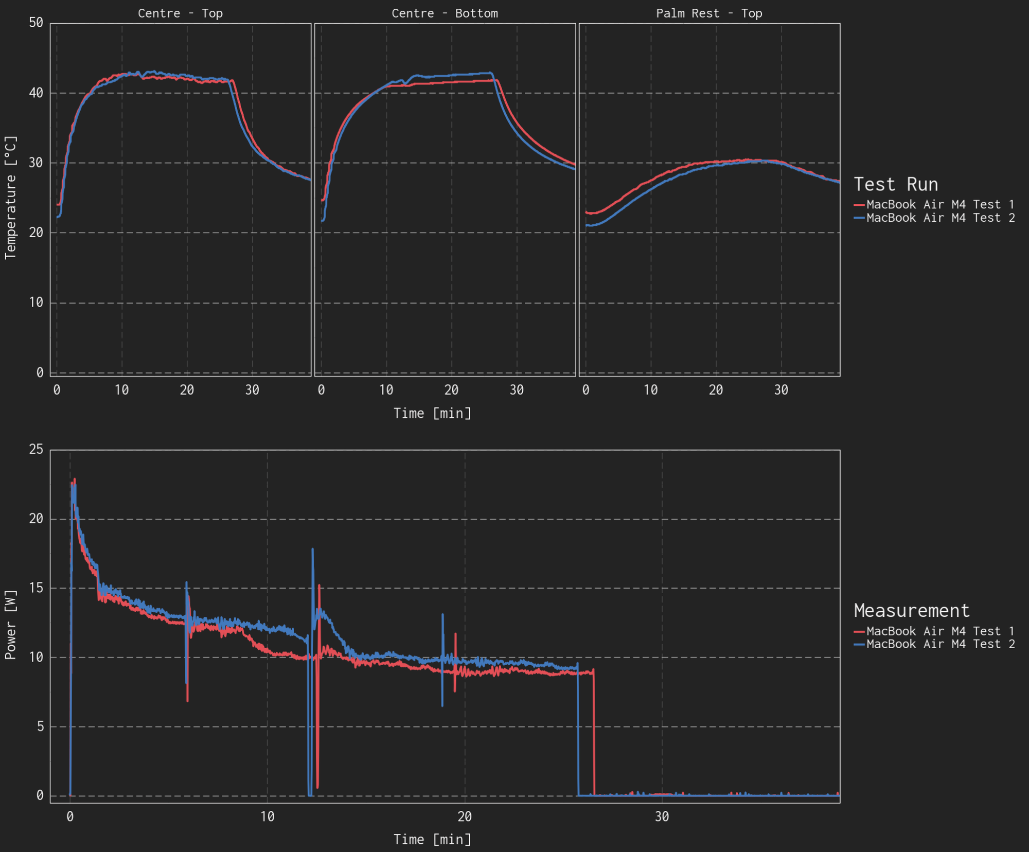 The plots above show that the MacBook Air M4 has a different temperature profile than the rest of the devices. The thermocouple on the top of the case reached higher temperatures than the bottom case, but then the temperatures equalized. We reapplied the thermocouples and conducted the test a second time with similar results, shown below.