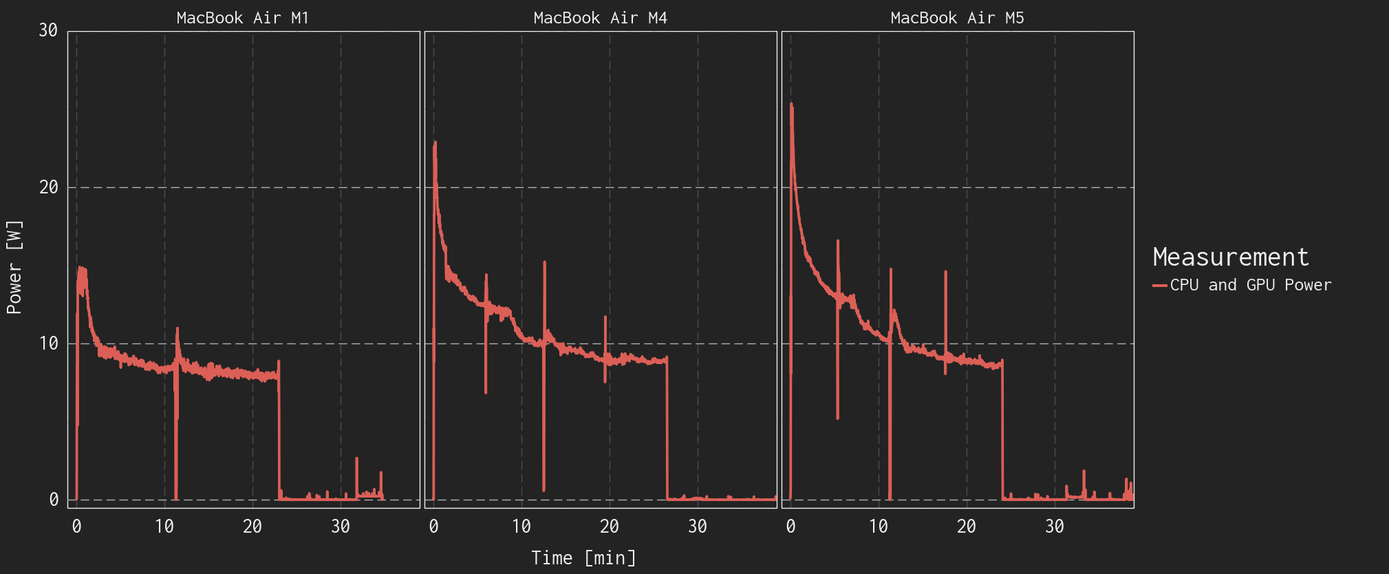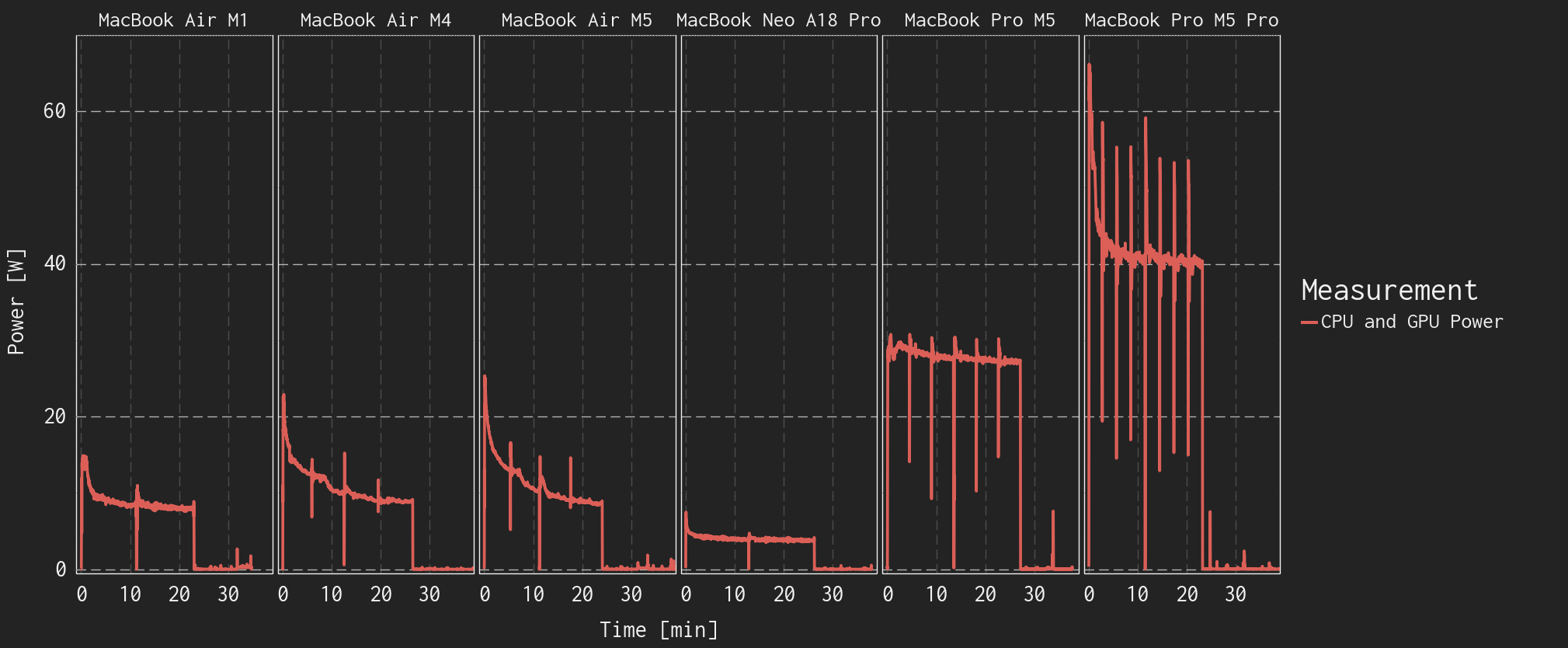 We used Cinebench 2026 to generate the {{tooltip: and heat}}load{{/tooltip}}, conducting two 10 minute CPU multi-threaded runs in a row, then letting the laptop sit idle for approximately 10 more minutes. The benchmark duration differs slightly between devices, but the endpoint of the benchmarks is clear in the power and temperature results. We used the macOS powermetrics tool to gather CPU and GPU power at 1 Hz.