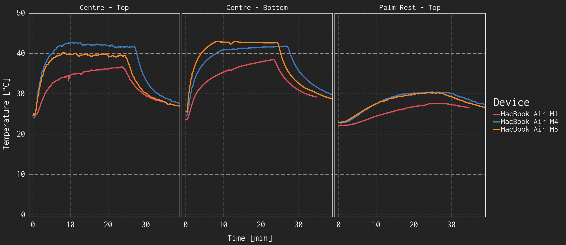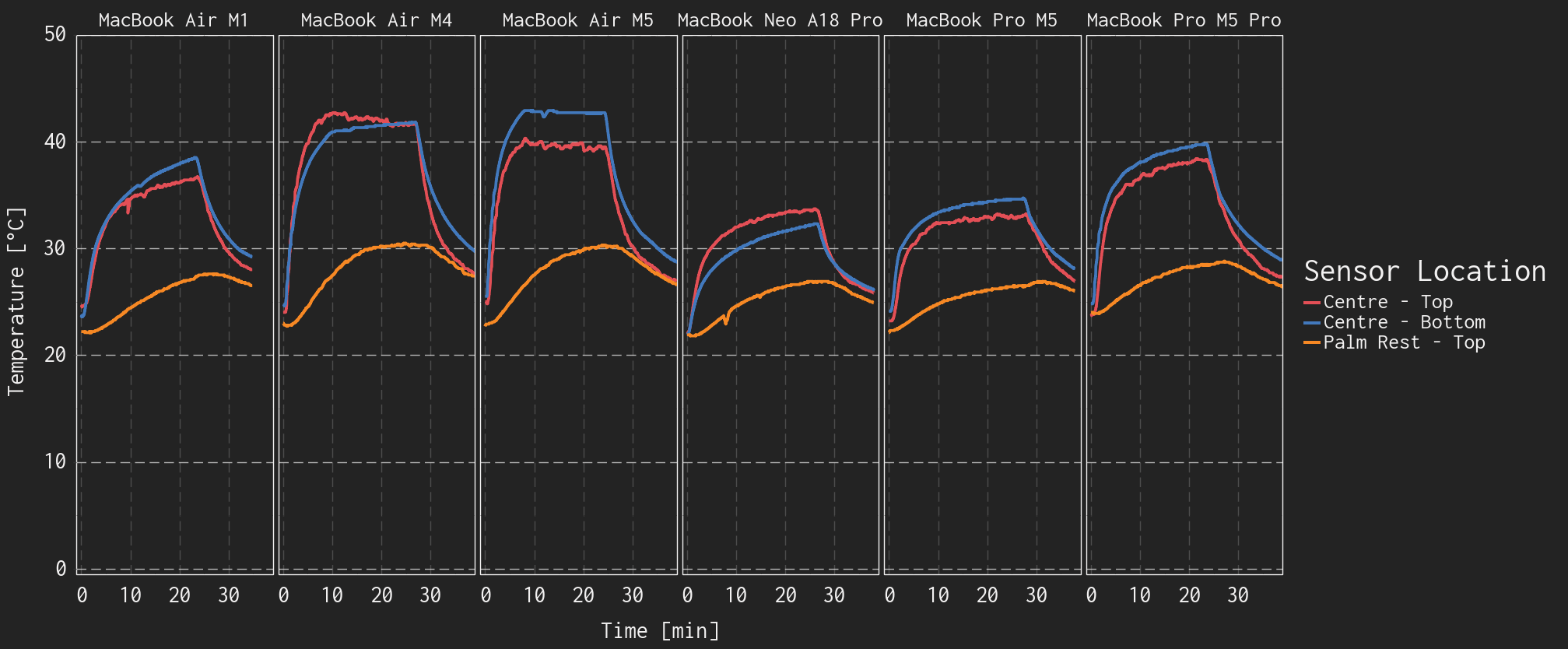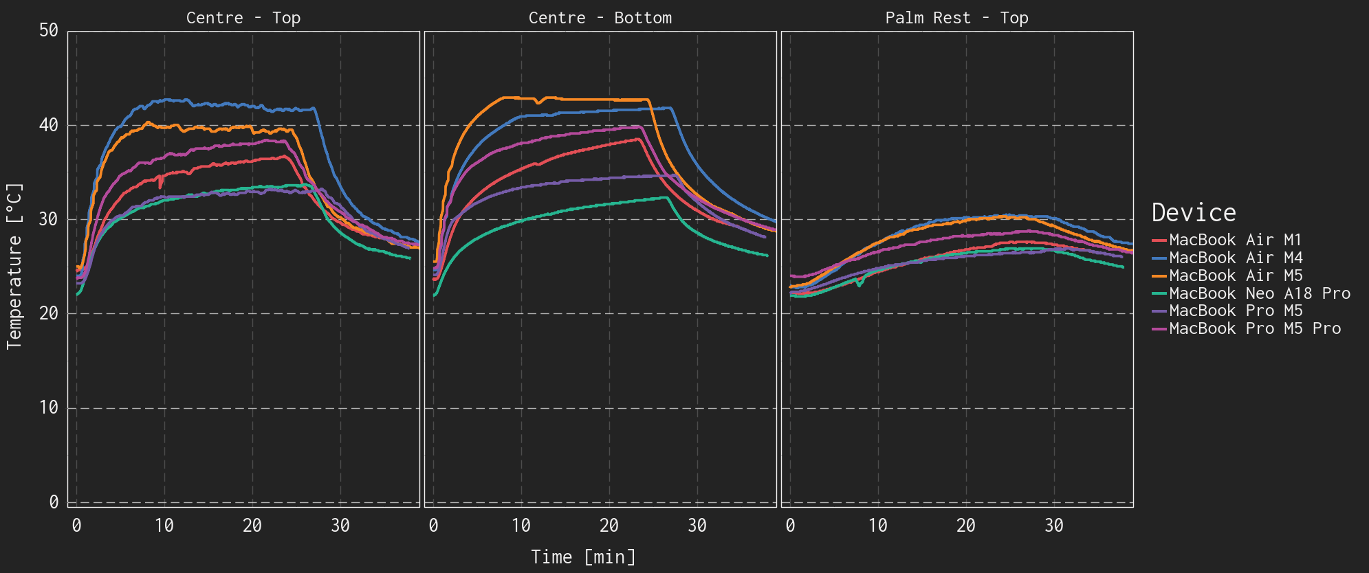 While we’ve had many MacBooks around for the testing of the MacBook Neo, MacBook Air M5, and MacBook Pro M5 Pro, we’ve done some exploration of surface temperature measurement.