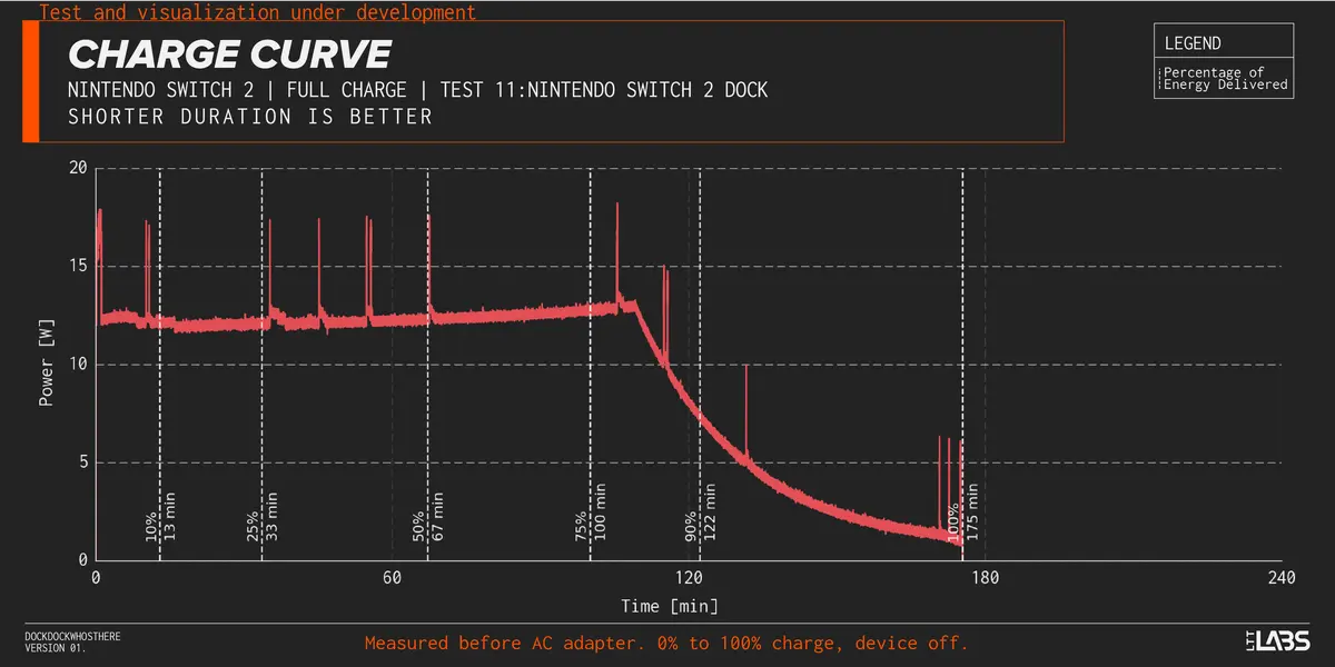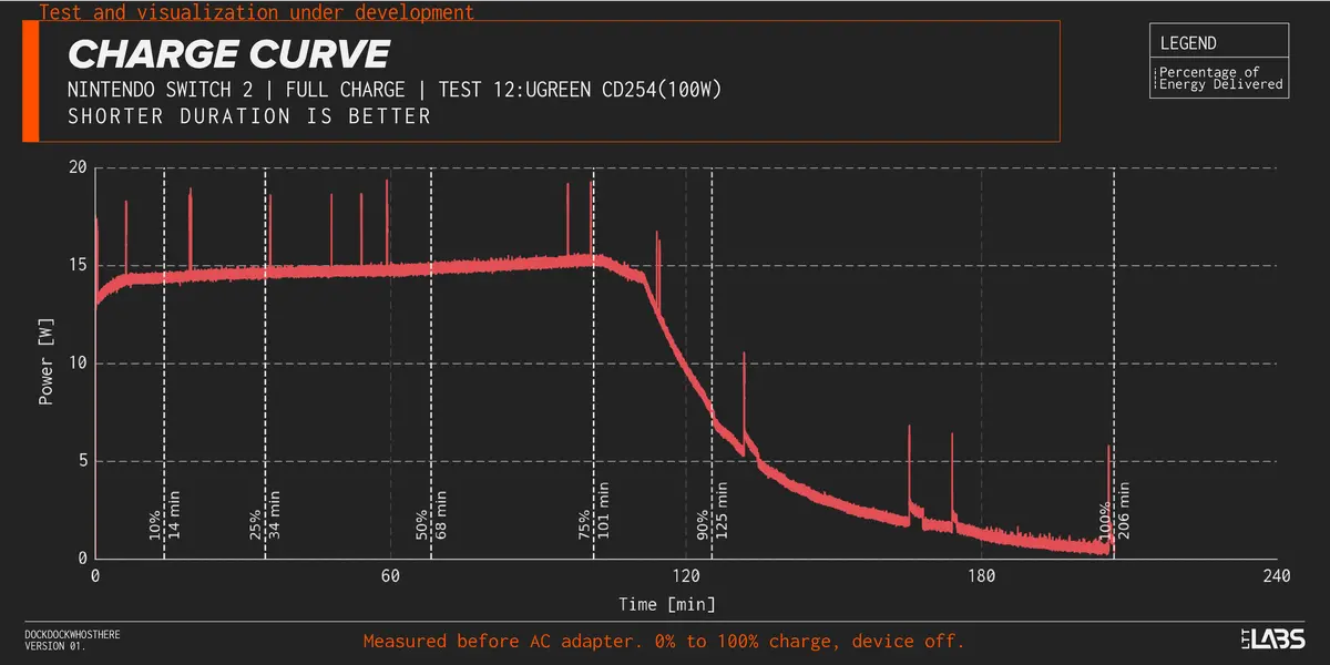We also conducted a couple tests using our Quarch PAM, measuring the power characteristics at the wall plug. We tested charging the Switch 2 using the Nintendo dock, as well as a 3rd party UGREEN 100W AC adapter. The charge duration graphs are shown below, but the end result is that they charged at roughly the same rate.