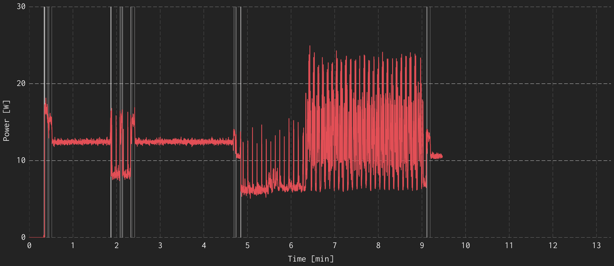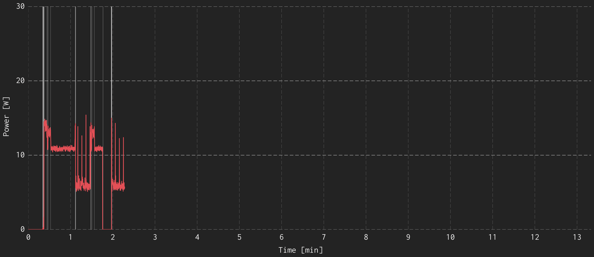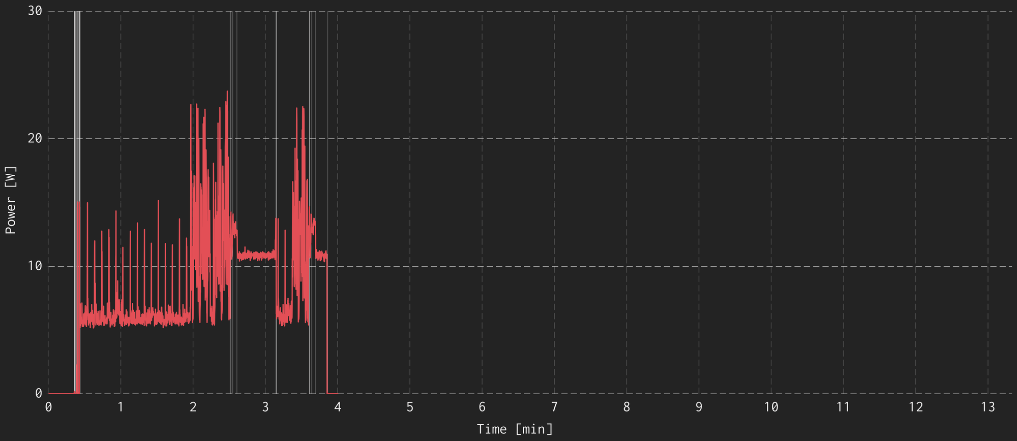 The tests vary in duration and I performed different actions with the Switch 2 in all cases, so they are not directly comparable. The sharp changes in measured wattage above/below 10 W are typically where the Switch 2 was turned on or off.
