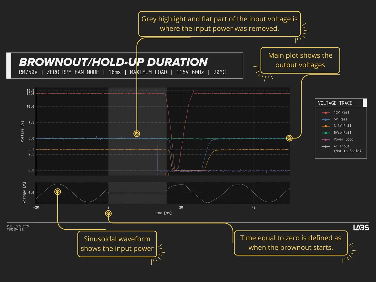 The sinusoidal waveform along the bottom of the graph shows the input power and the main plot shows the output voltages. The zero on the x-axis is when the start of the "brownout" is applied. The gray highlight and flat part of the input voltage show when the input power was removed from the power supply. Some power supplies will completely shut down after a power dropout, while others will drop the outputs momentarily but then "recover" to nominal output levels.