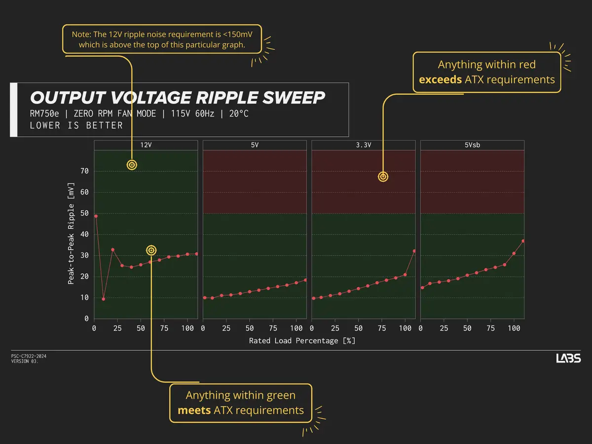 Ripple noise, though inevitable, can impact system performance. These graphs depict the amount of "noise" present in the PSU's output signals. A theoretical DC output will be completely steady and flat, but because this is the real world there will be some "noise". Suppose the amplitude of the noise is too high. In that case, the computer components may run into problems or completely fail to operate because the computer relies upon steady and clean power to perform optimally.