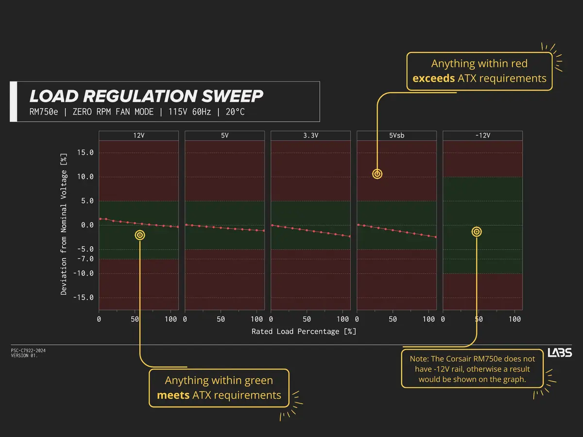 Voltage regulation is crucial for maintaining system stability. Our voltage regulation graphs illustrate how consistent the output voltage of the PSU is across the entire load range. A perfect PSU will show a flat line, indicating consistent voltage output regardless of load. A drastic decrease in the output voltage as the load increases is an unfavorable result, and if bad enough it could cause problems as computers cannot operate properly if the supplied voltage is outside of the acceptable range. We provide color-coded sections to indicate ATX pass or fail criteria, making it easy to identify potential issues. Anything within the green section meets ATX requirements while the red section indicates points exceeding the requirements. Note that some of the output rails have different requirements.