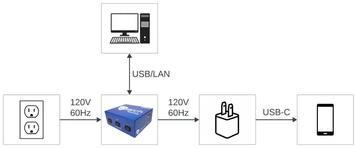 The block diagram below shows the test setup, with the Quarch QTL2843 serving as the sole measurement device. This device serves many functions (connections, power delivery, measurement, monitoring) and allows the setup to be fairly simple. The QTL2843 is placed between the mains grid (wall outlet) and the device being charged. It monitors and logs the electrical characteristics to the USB or LAN connected computer.