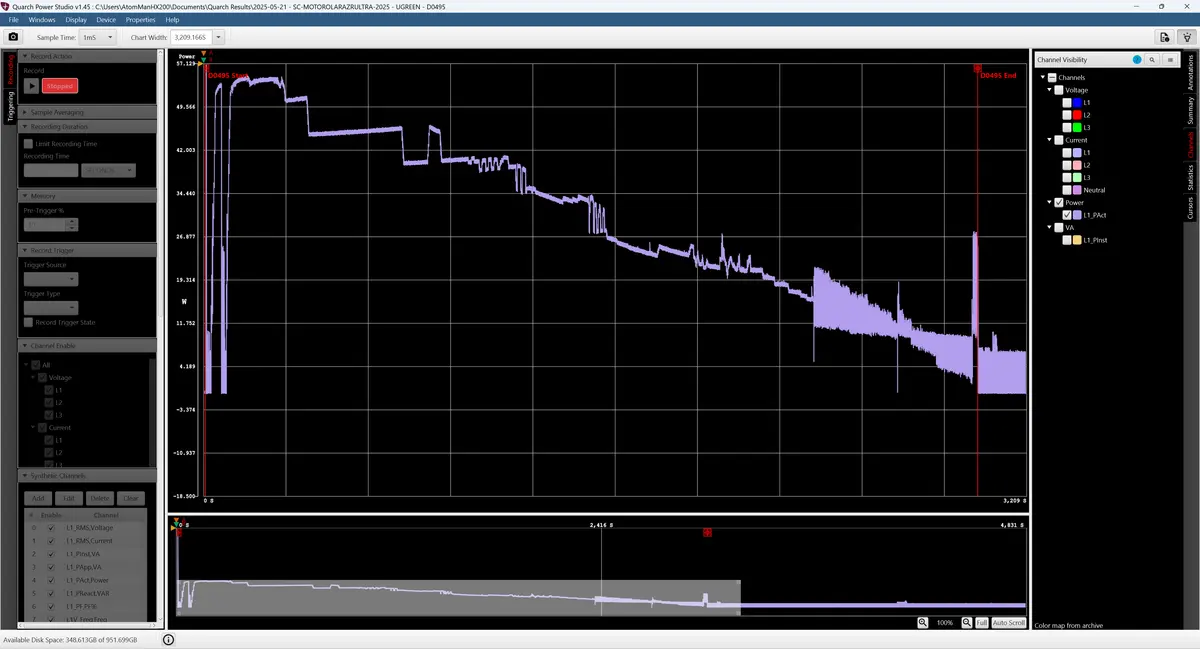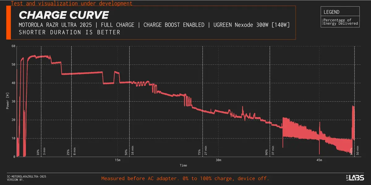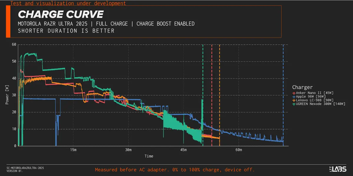 We've been including the mobile charge test in ShortCircuit videos since December 2024, but we've recently created a new visualization that adds much more context on the charging process. In this article we'll cover the test that we currently conduct, our new visualization (along with some of its limitations), and an interesting finding from the Motorola razr ultra 2025.