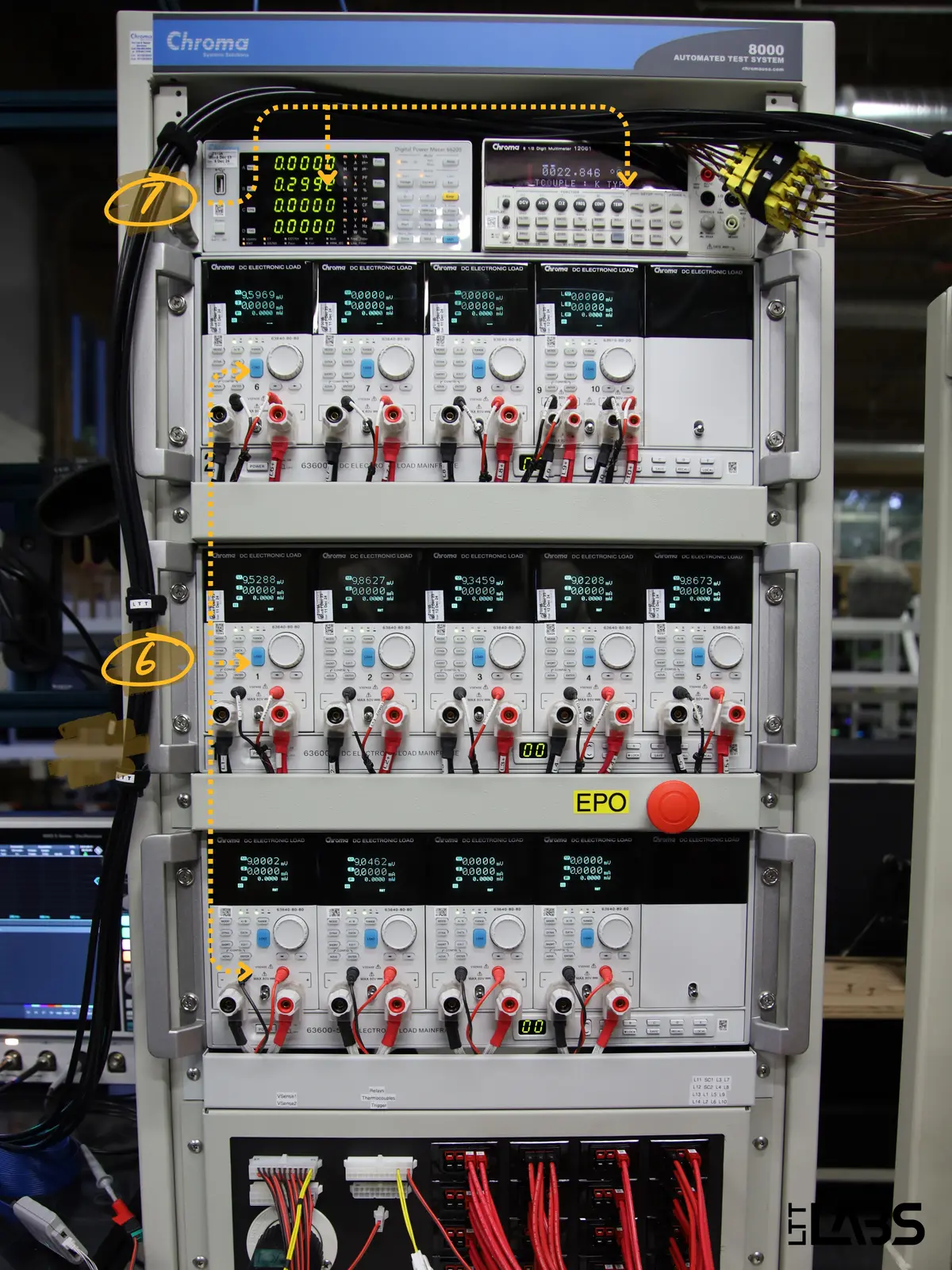 6. Single Channel Loads (Chroma 63640-80-80) and Dual Channel Loads (Chroma 63610-80-20): Single Channel Loads can handle up to 80 volts or 80 amps, with a maximum of 400 watts. Dual Channel Loads handle up to 80 volts or 20 amps per channel, with a 100-watt limit per channel. Both are used to simulate the load of a computer.