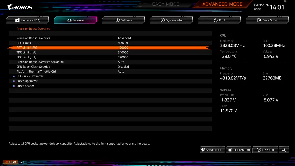 During our core tests for the LTT video, we found that the 9700X seemed constrained by the default 88W PPT limit, which is beneficial for keeping temperatures low. To test if this limit was holding back performance, we adjusted the PPT limit in the BIOS by setting PBO to advanced mode, and further set the PBO limits to manual to have full access to the PPT wattage.