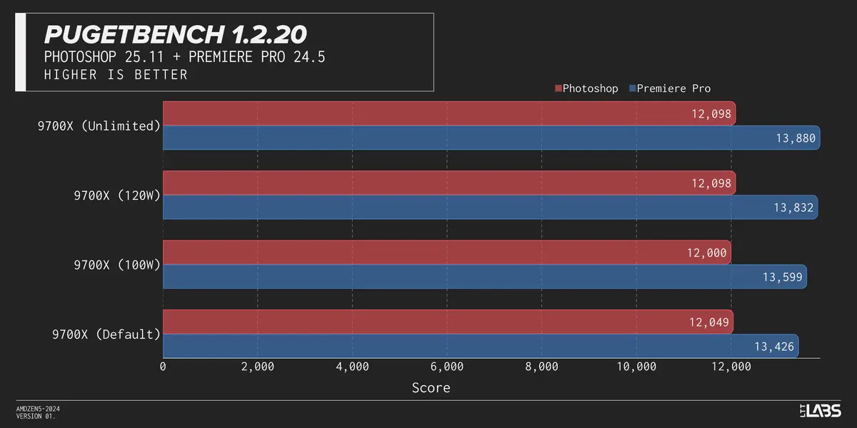 In PugetBench Photoshop, the performance gains from increasing the PPT were negligible. The score only slightly improved from 12049 on the stock PPT to 12098 on the 120W PPT, identical to the score under the unlimited PPT. This suggests that the test might be limited by factors other than wattage.