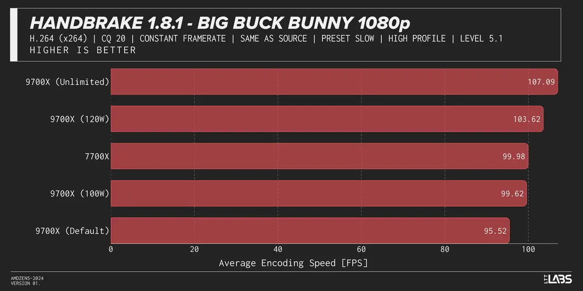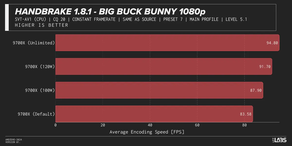 In Handbrake, the 100W PPT delivered an average encoding speed of 87.90 FPS for AV1, marking a 5% improvement over the default. However, in x264, it barely underperforms compared to the 7700X, with an average encoding speed of 99.62 FPS versus the 7700X’s 99.98 FPS. Notably, the 9700X matches the 7700X’s x264 performance while drawing less power, which is a benefit. Still, for noticeable gains over the previous generation in x264, at least a 120W PPT is recommended.