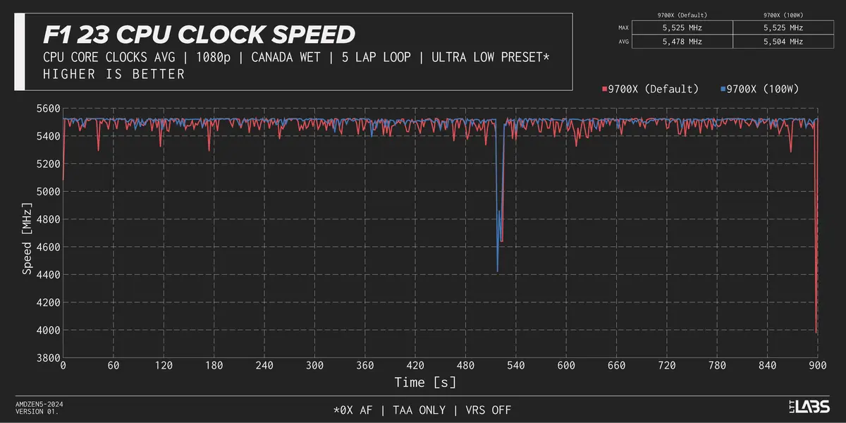 Indeed, the data supports this, showing behavior similar to that of the 120W PPT. Testing the 100W PPT in F1 23 showed the chip consuming between 91-95W with an average clock speed of 5504 MHz. So for gaming, setting the PPT to 100W should allow the CPU to maintain max turbo for an extended duration.