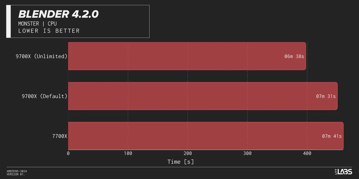 Removing the wattage restriction yielded immediate performance gains. In Cinebench 2024, the multi-core score increased from 1187 to 1305—a nearly 10% improvement over the 7700X’s score of 1157. In Blender 4.2.0, rendering times dropped from 7 minutes 31 seconds to 6 minutes 38 seconds, a marked improvement over the 7700X’s 7 minutes 41 seconds. Similar performance gains were observed across tests like Handbrake, 7-Zip, Godot Compile, and PugetBench.