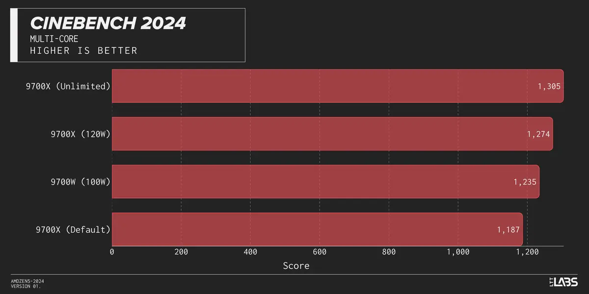 Our next objective was to identify the point of diminishing returns by testing the 9700X at a 120W PPT limit. Historically, this is where a base TDP of 90W would land under PPT boost load. Although there were rumors[1][2] that AMD might increase the base TDP to 120W, this did not come to fruition. Nevertheless, performance at 120W PPT was impressive, with a Cinebench multi-core score of 1274, compared to 1187 at the default PPT and 1305 at unlimited PPT.