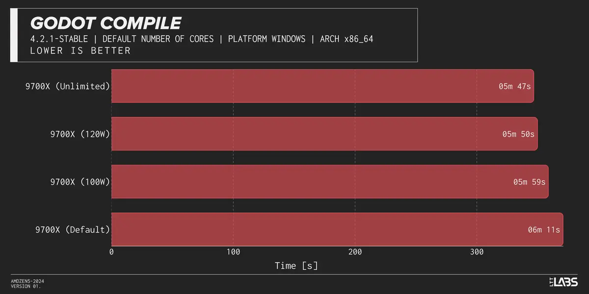 In the Godot compile test, the 120W PPT and unlimited PPT delivered nearly identical results, with times of 5 minutes and 50 seconds and 5 minutes and 47 seconds, respectively. The 120W PPT still offered a 5% improvement over the stock PPT, which took 6 minutes and 11 seconds to complete the task.