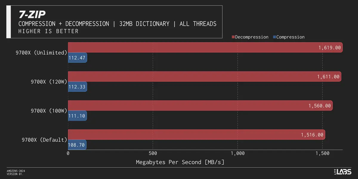 In 7-Zip, the 100W PPT landed between the default and 120W settings, with a compression rate of 111.10 MB/s and a decompression score of 1560 MB/s. This is a modest 2-3% improvement over the stock PPT, indicating that the slight increase in wattage doesn’t significantly impact performance in this benchmark.