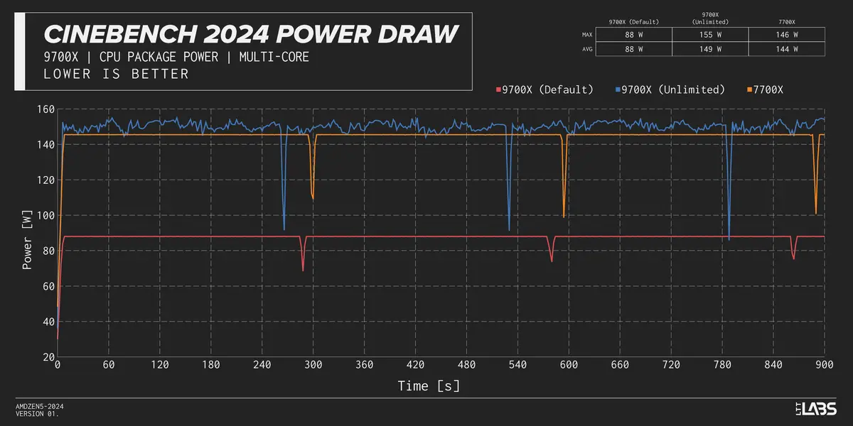 AMD's Ryzen 9000 series launch is characterized by its promise of "the ultimate performance meets incredible efficiency." When we subjected the Ryzen 5 9600X and Ryzen 7 9700X to our testing process for the LTT video for this launch, Labs identified a noteworthy observation: the Ryzen 7 9700X appears to be better suited for a higher TDP classification. As highlighted in the video, once the PPT was set to unlimited, the 9700X readily consumed 140W of power while operating well within its TJMax constraints.