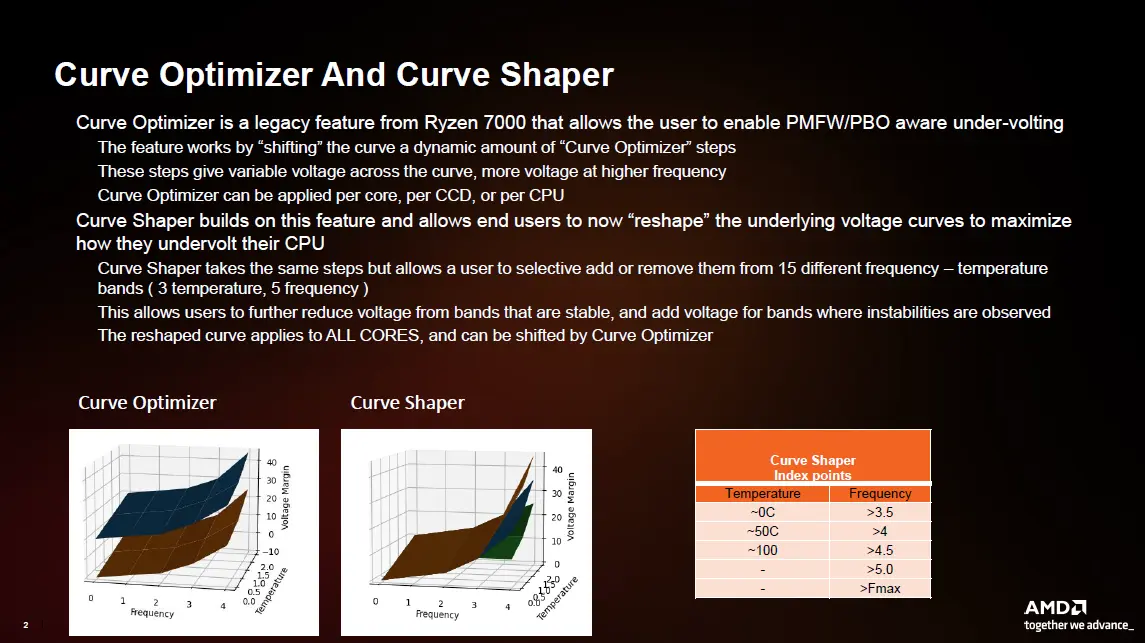 The prior Ryzen 7000 series introduced the Curve Optimizer, a feature that allowed for PBO-aware undervolting by dynamically adjusting voltage across the curve. The new Curve Shaper builds upon this, enabling users to fine-tune voltage curves across 15 distinct frequency and temperature bands, thereby optimizing undervolting potential.