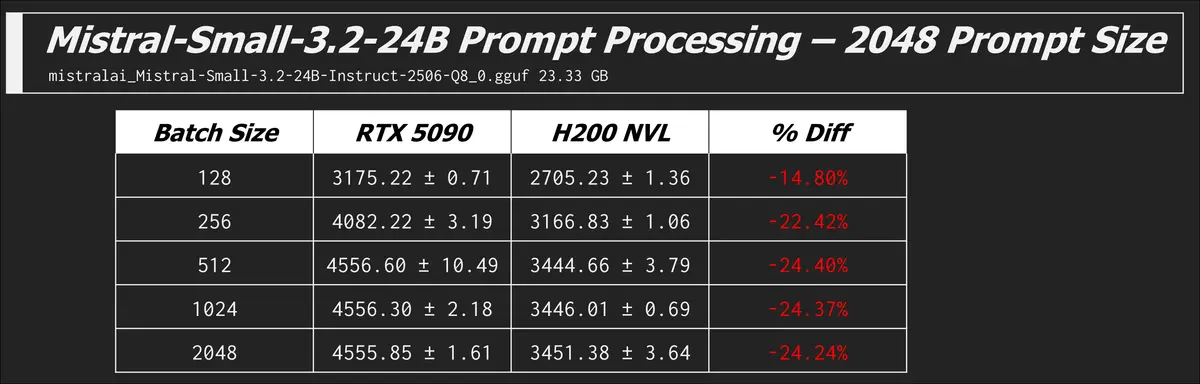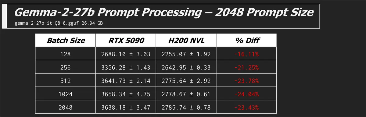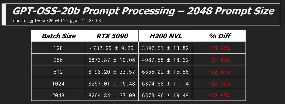 Here are some other models and prompt processing results which all tell the same story of the 5090 beating the H200...