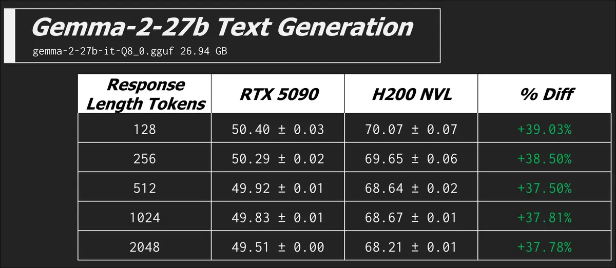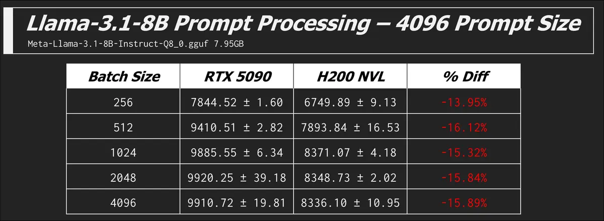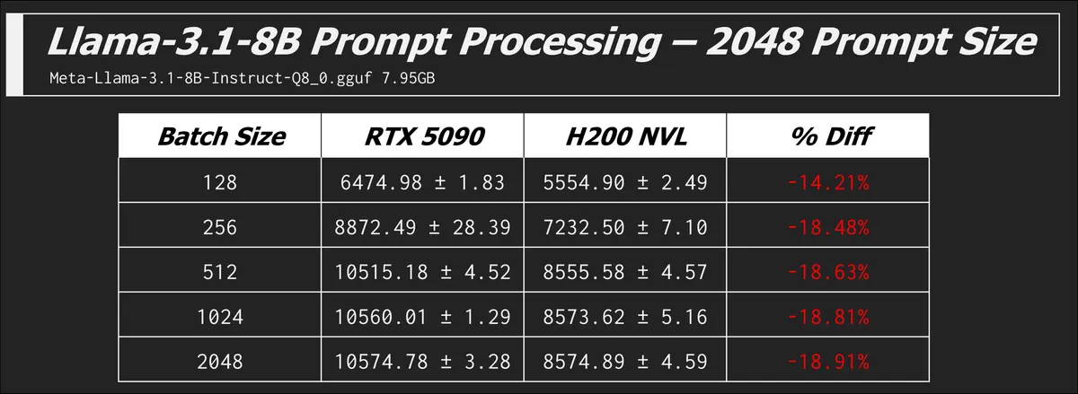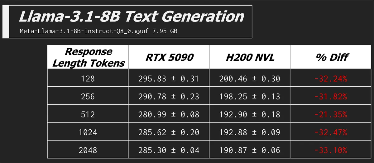 Given what we now know, the RTX 5090 should technically win when compute is king. And this is true when the model fits comfortably in VRAM. The first model we will test is the 7.95GB Meta-Llama-3.1-8B-Instruct-Q8_0.gguf, easily sliding into the 32GB of the 5090 and the spacious 141GB of the H200 NVL.