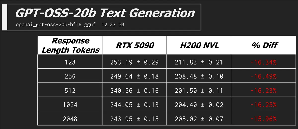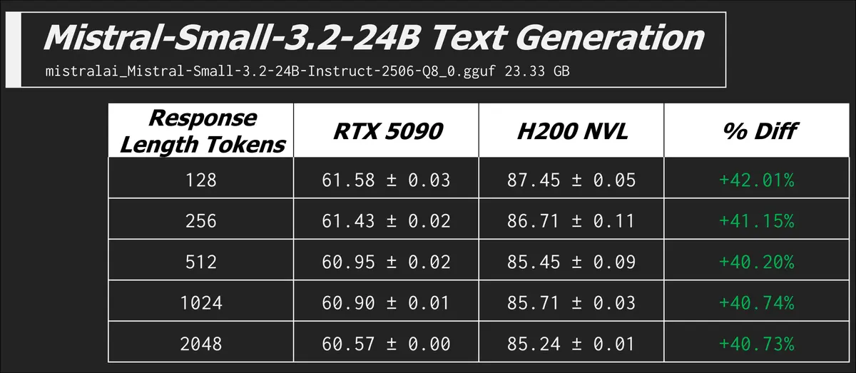 Okay cool, now we see what the H200 NVL is good for and that memory bandwidth is now overshadowing the compute difference between itself and the RTX 5090. This was a tiny model, let's try something a bit larger.