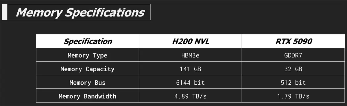 The H200 NVL is built around a Hopper GH100 chip, while the RTX 5090 has a Blackwell heart. It also nearly has a 30% core count advantage over the H200 NVL, not to speak of the architectural improvements over the Ada Lovelace (RTX 4000 series) era technology of Hopper.