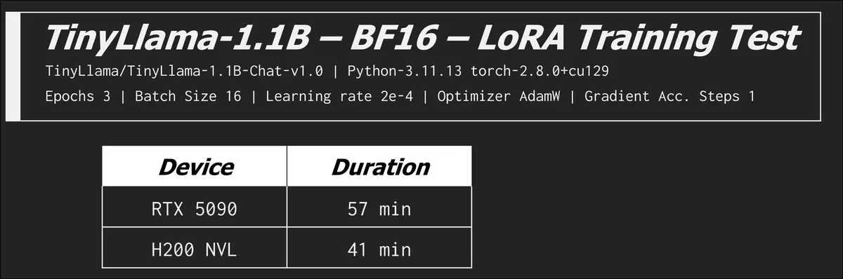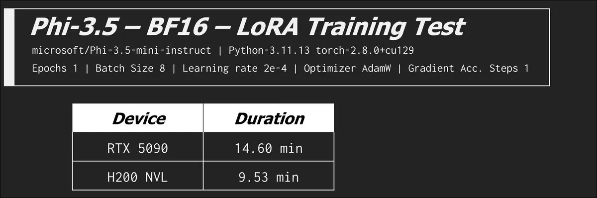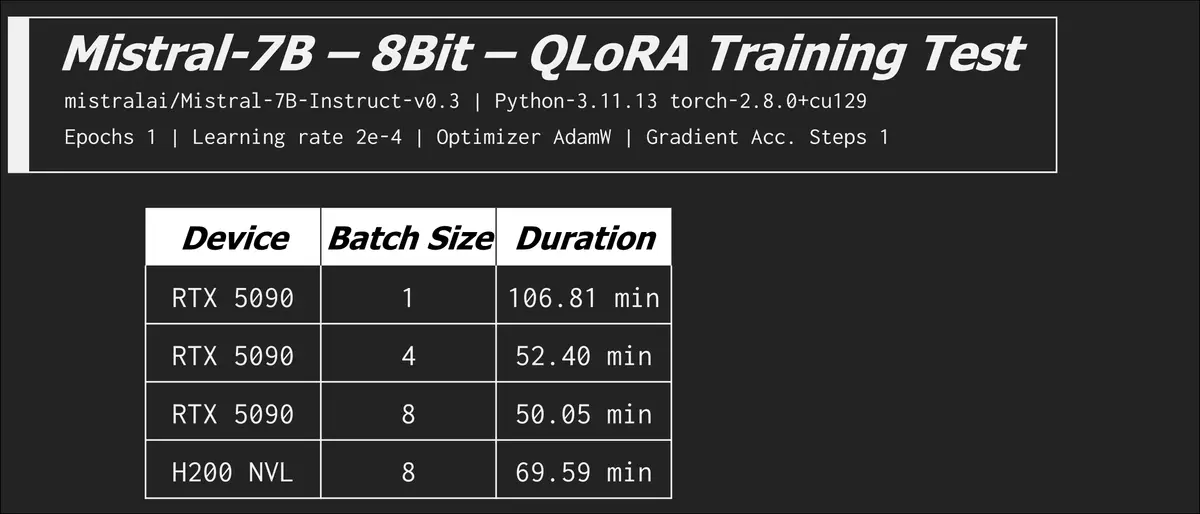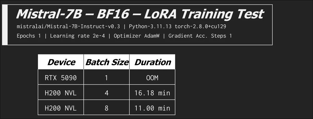 In the last row see how the RTX 5090 goes back to beating the H200 NVL? When we remove the memory bottleneck the compute advantage rears its head. There are optimizations and configurations you can tweak to exchange VRAM usage for time, but it can be very time costly. We saw the batch size of 8 (LorA) on the H200 NVL increase from 11 minutes to over an hour!